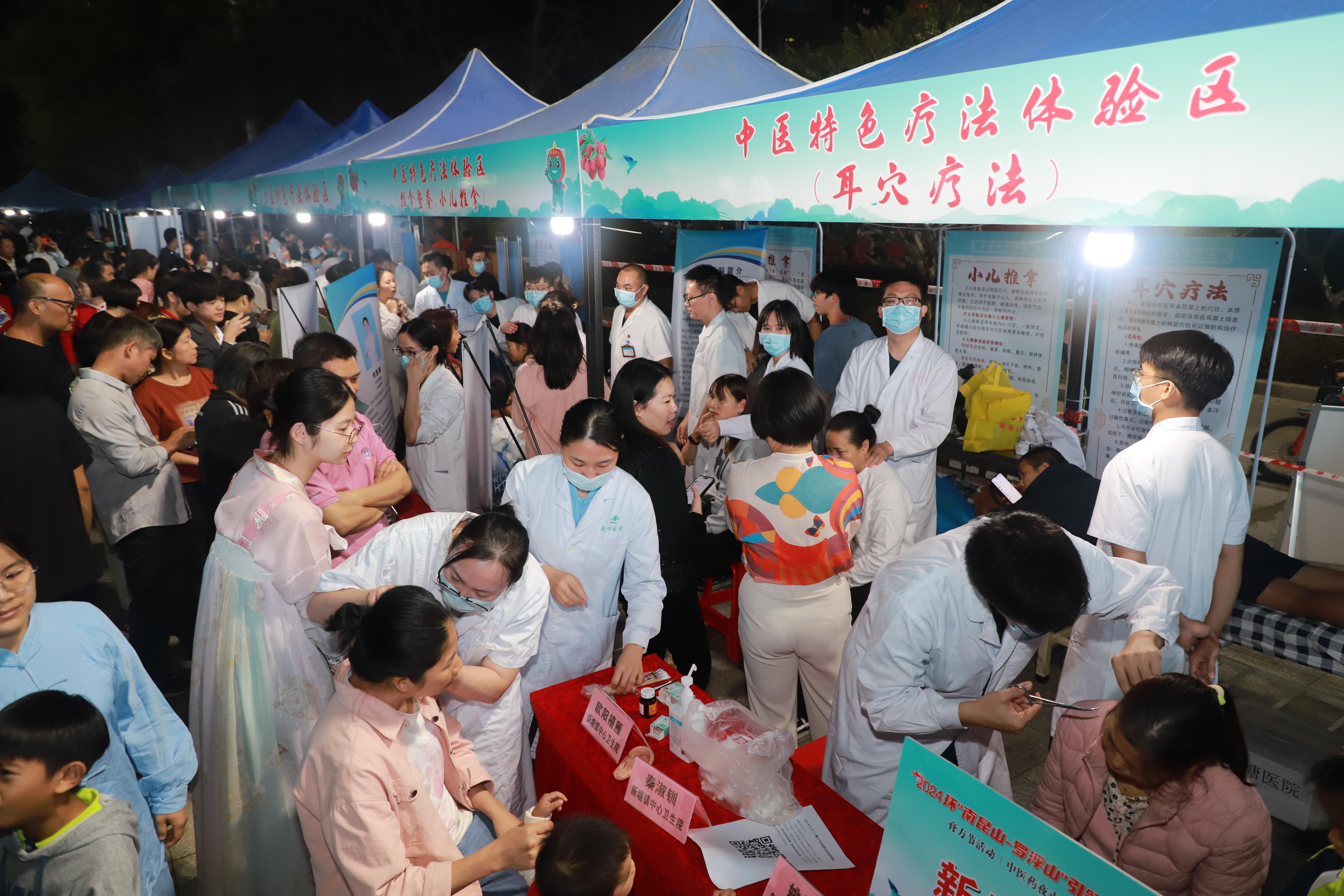 刮痧、艾灸、火龙罐、耳穴疗法、针刺、推拿……随着夜幕降临,活动现场热闹非凡,中医特色疗法体验区前排起了长队。“用针灸刺激合谷穴,有疏风解表、镇静止痛、调节月经等作用。”在针刺摊位,针灸科医生一边娴熟操作,一边向记者介绍日常保健知识。