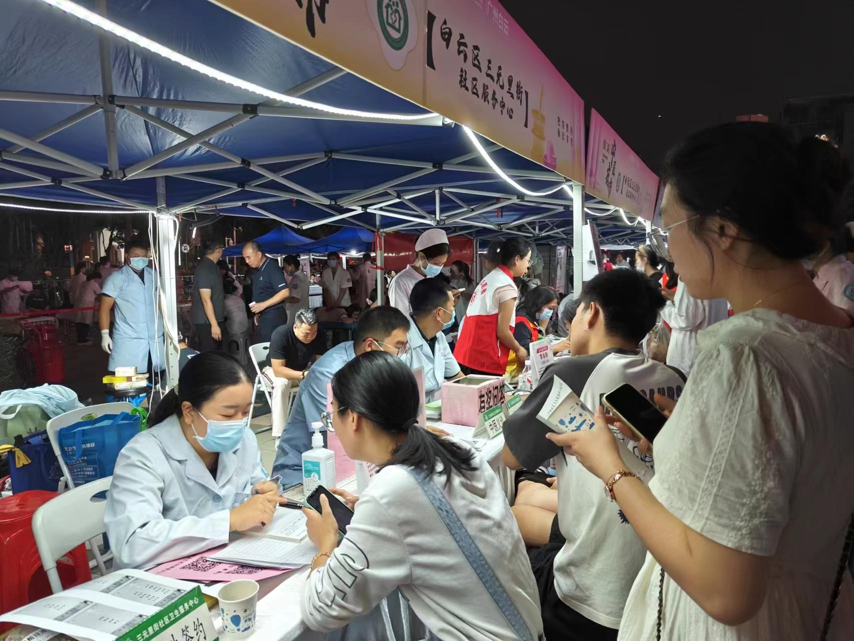 当天晚上7点多,夜市内开始人潮涌动。三元里街社区卫生服务中心的摊位前设置了中药代茶饮、中医义诊、中医理疗、中医科普、中药辨识游戏等活动。在茶饮游戏区前围着不少年轻人在辨识中草药,大家在轻松的环境中,不仅享受到逛“夜市”的乐趣,还学习到中医药文化知识,实现寓教于乐。