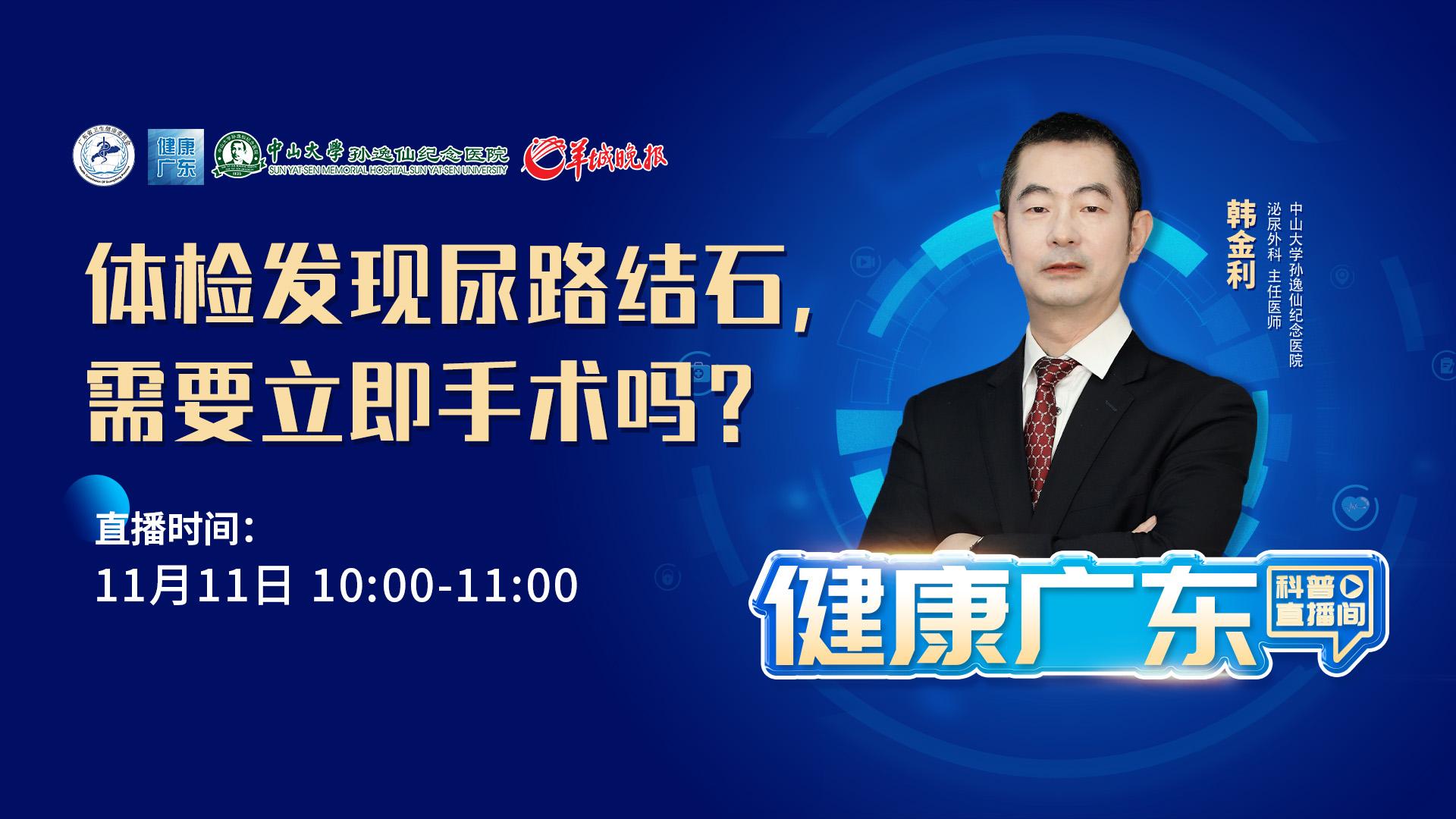 在广东省卫健委的指导下,中山大学孙逸仙纪念医院联合羊城晚报联合推出“大咖云集探‘泌’解惑”系列直播。11月11日,我们特别邀请中山大学孙逸仙纪念医院泌尿外科泌尿系结石专科韩金利直播开讲“体检发现尿路结石,需要立即手术吗”,其中的精彩内容与读者分享。