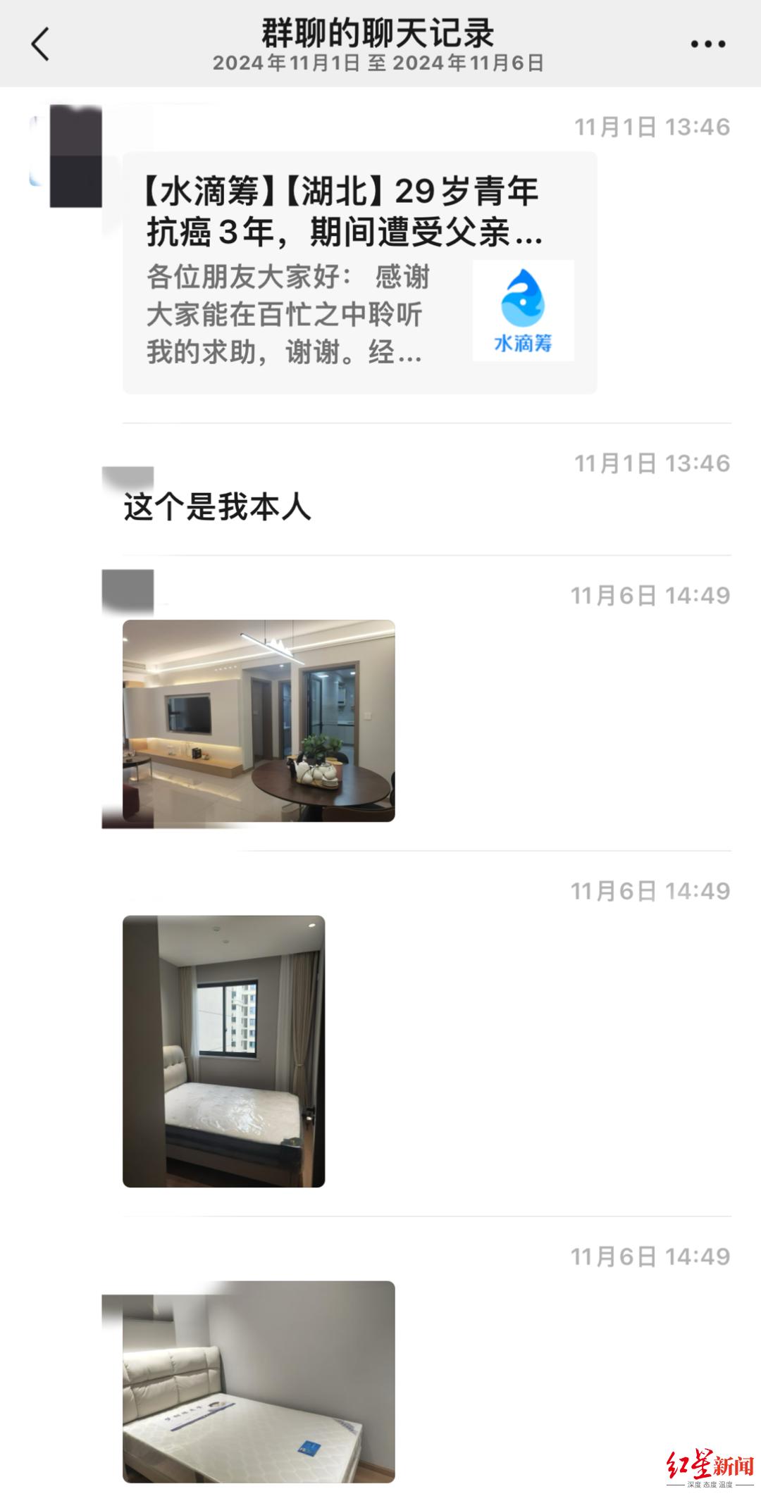 多位受访的爱心捐赠者告诉记者,兰某飞今年11月1日在群里发布筹款消息,但11月6日便在群里晒新房照,此时兰某飞自称短短几日已筹款约70万元。