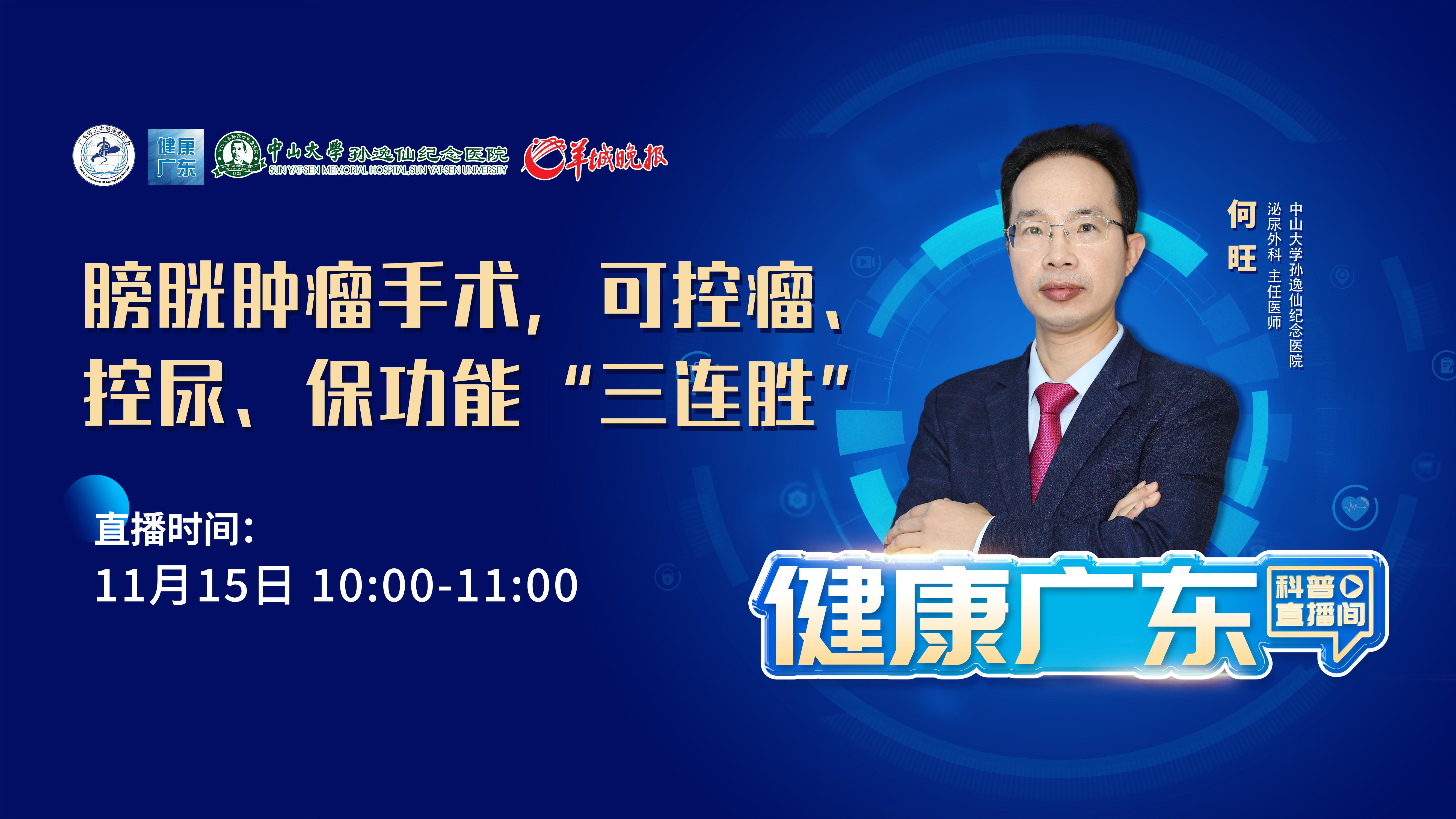 在广东省卫健委的指导下,中山大学孙逸仙纪念医院联合羊城晚报联合推出“大咖云集探‘泌’解惑”系列直播。11月15日,我们特别邀请中山大学孙逸仙纪念医院泌尿外科副主任何旺直播开讲“膀胱肿瘤中手术,可控瘤、控尿、保功能”,其中的精彩内容与读者分享。