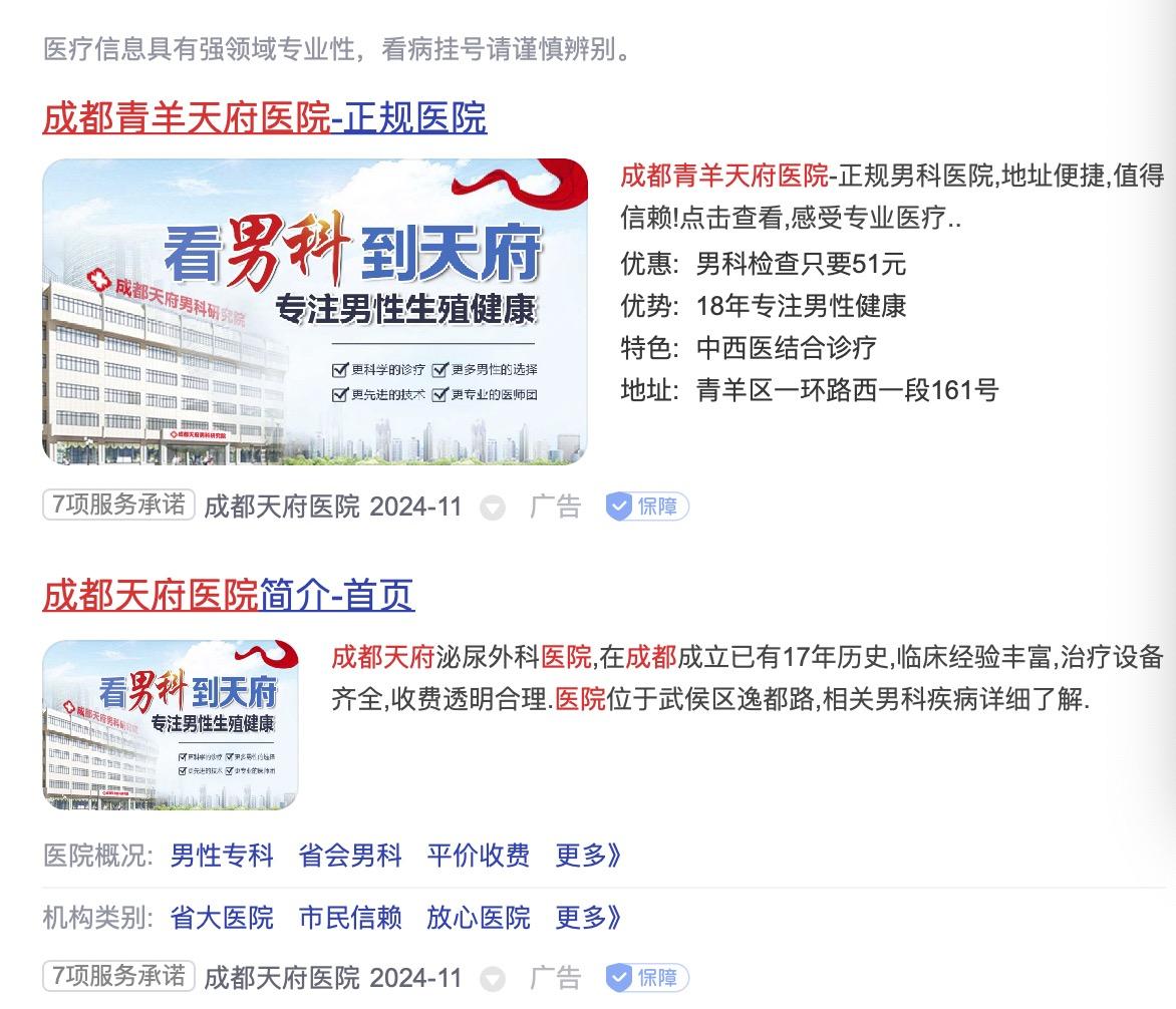 媒体查询相关信息发现,针对该院的投诉不止上述一起。2024年9月26日,一位家长在四川“群众呼声”平台投诉,孩子经青羊天府医院诊疗为包茎,有轻微炎症。经多次治疗,花费两万多。家长咨询了其他医生后,认为割包皮,治疗炎症花两万多可能是“被宰”了。