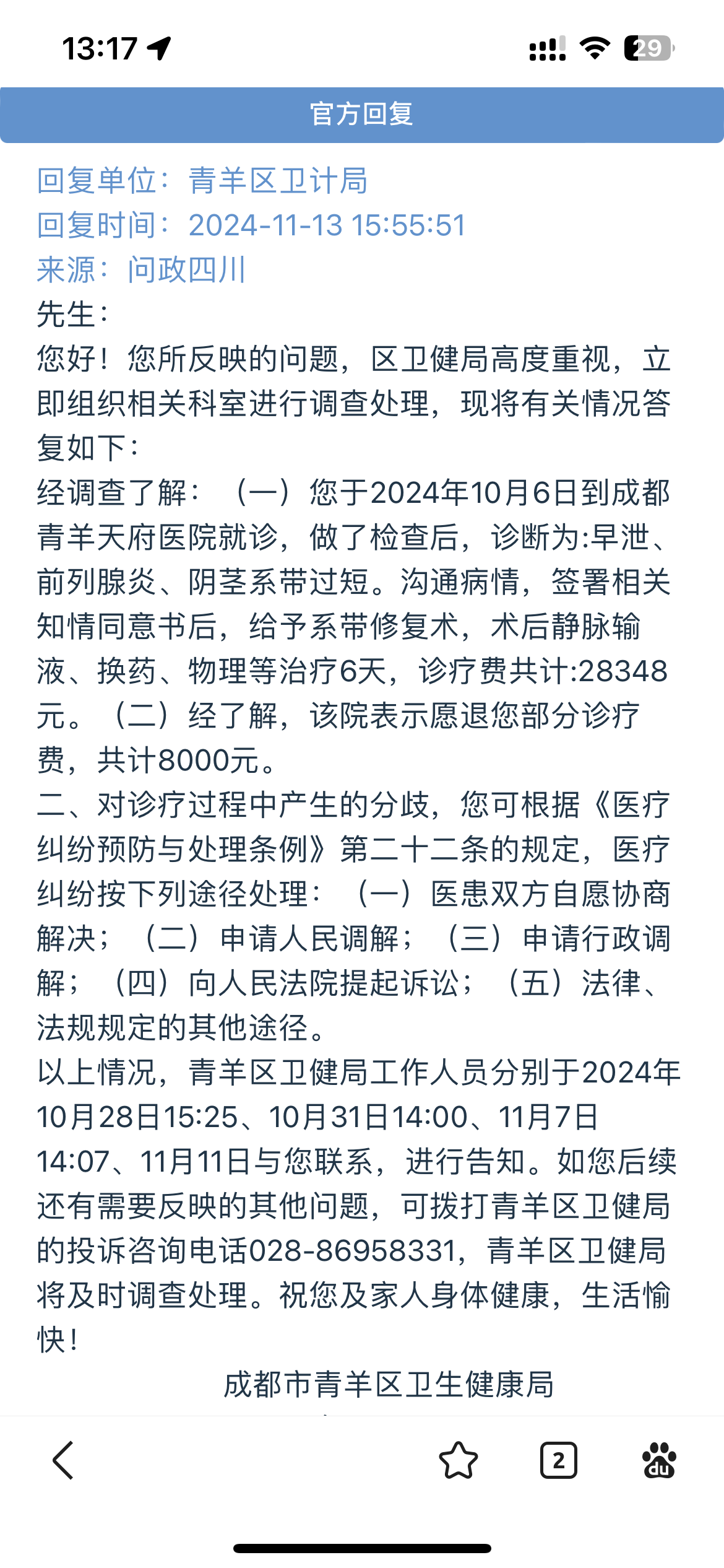 11月13日,成都市青羊区卫生健康局(简称“卫健局”)通过“问政四川”平台回复确认,该局调查了解之后,成都青羊天府医院表示愿意退还部分诊疗费,共计8000元。
