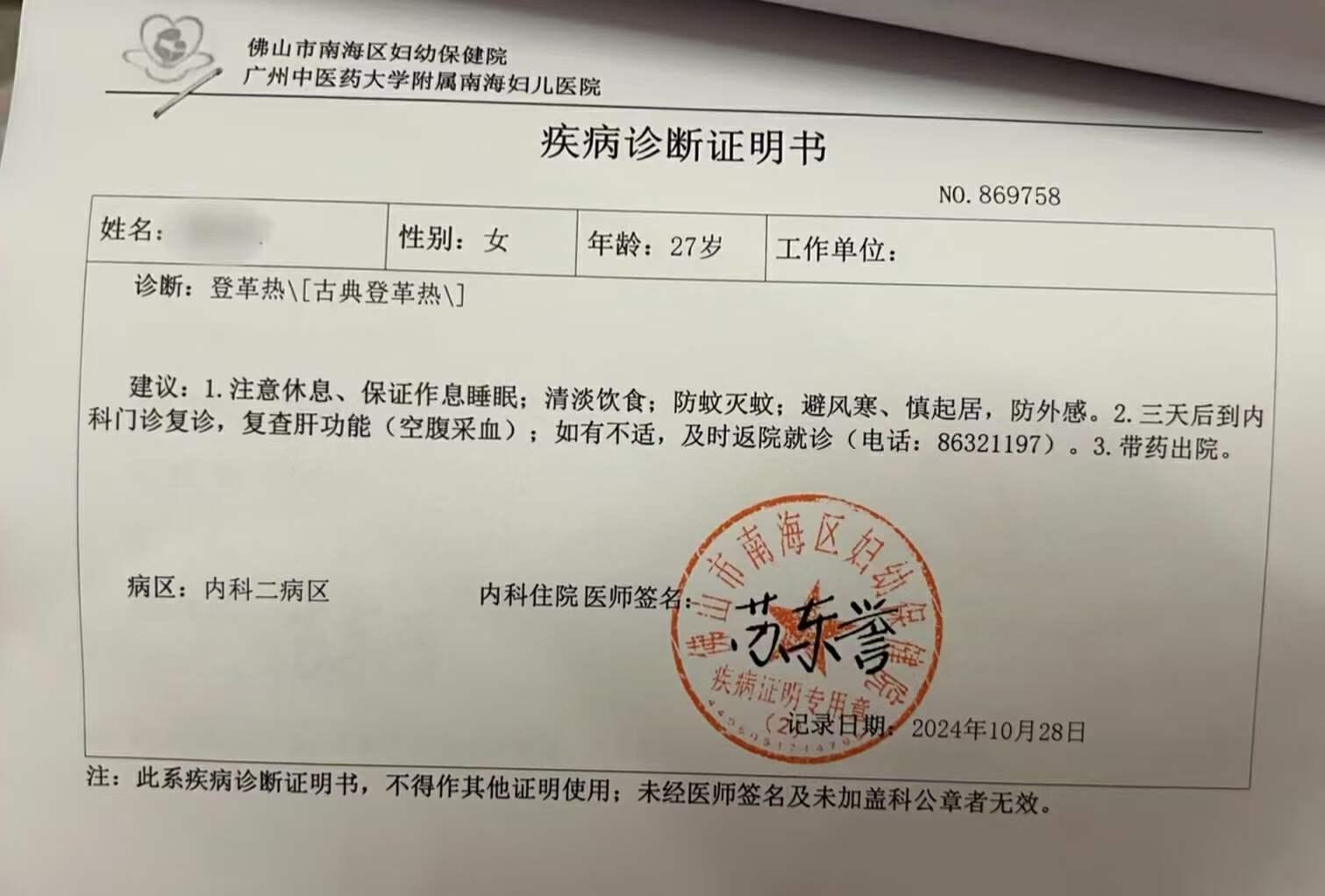 令郑琪琪没有想到的是,自己这次从登革热中恢复的时间如此漫长。她自觉平时感冒无须吃药,只喝柠檬水、补充维生素C就能很快自愈。10月26日,本来应该跟着同事出差去成都学习,郑琪琪却还在病房里,她操作机票退款,只退还了30%左右。住院六天,她一共花费3279.11元,医保报销后1661.99元。从感染到出院,她10天没有上班,她估算,大概损失了四五千元,“就当破财消灾了”。