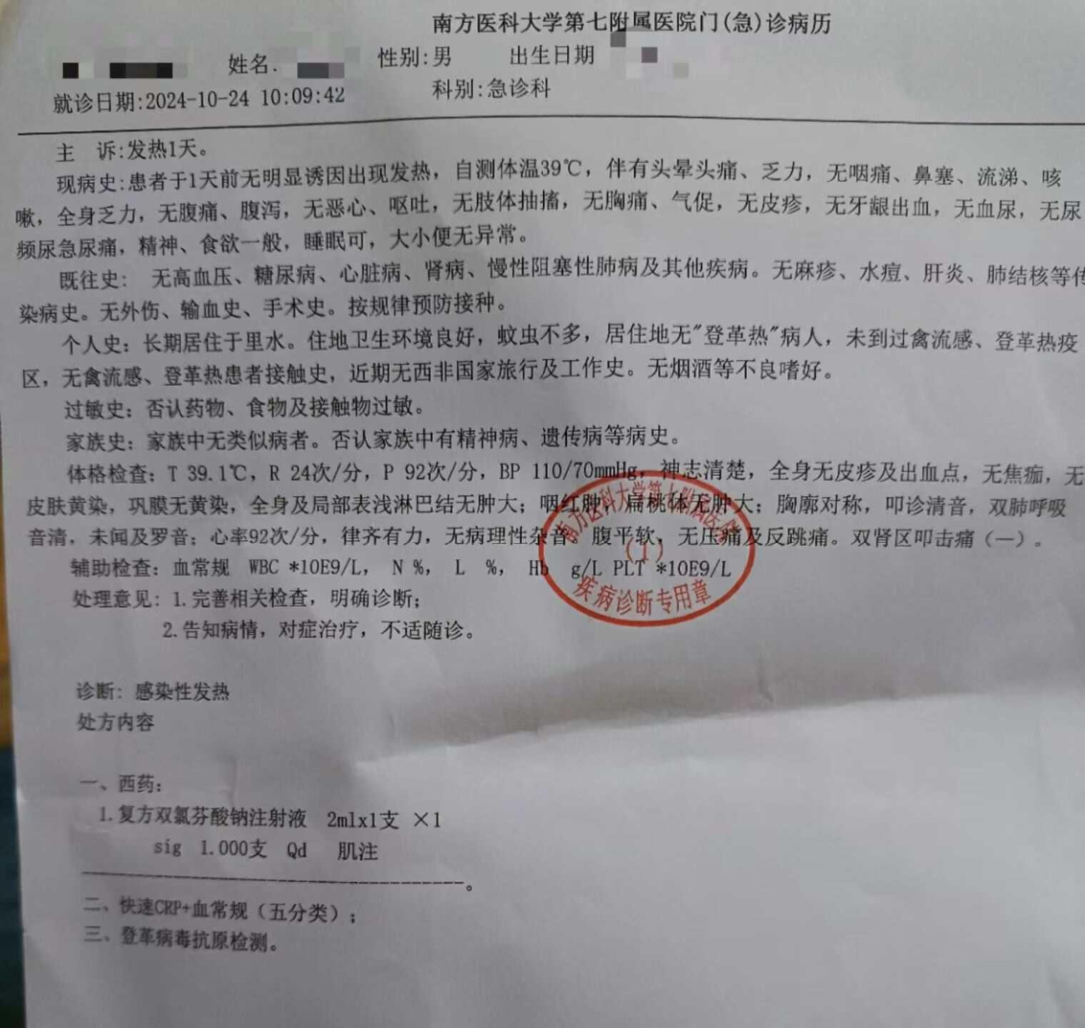 李峰家住佛山里水镇,那个中午,以为只是普通感冒,他专门买来药喝,睡了午觉,当晚却发烧至38.7度,头越来越昏沉。第二天,在医院被确诊登革热后,他才意识到,“实际上蚊子到处飞,在哪里都有可能感染登革热。”