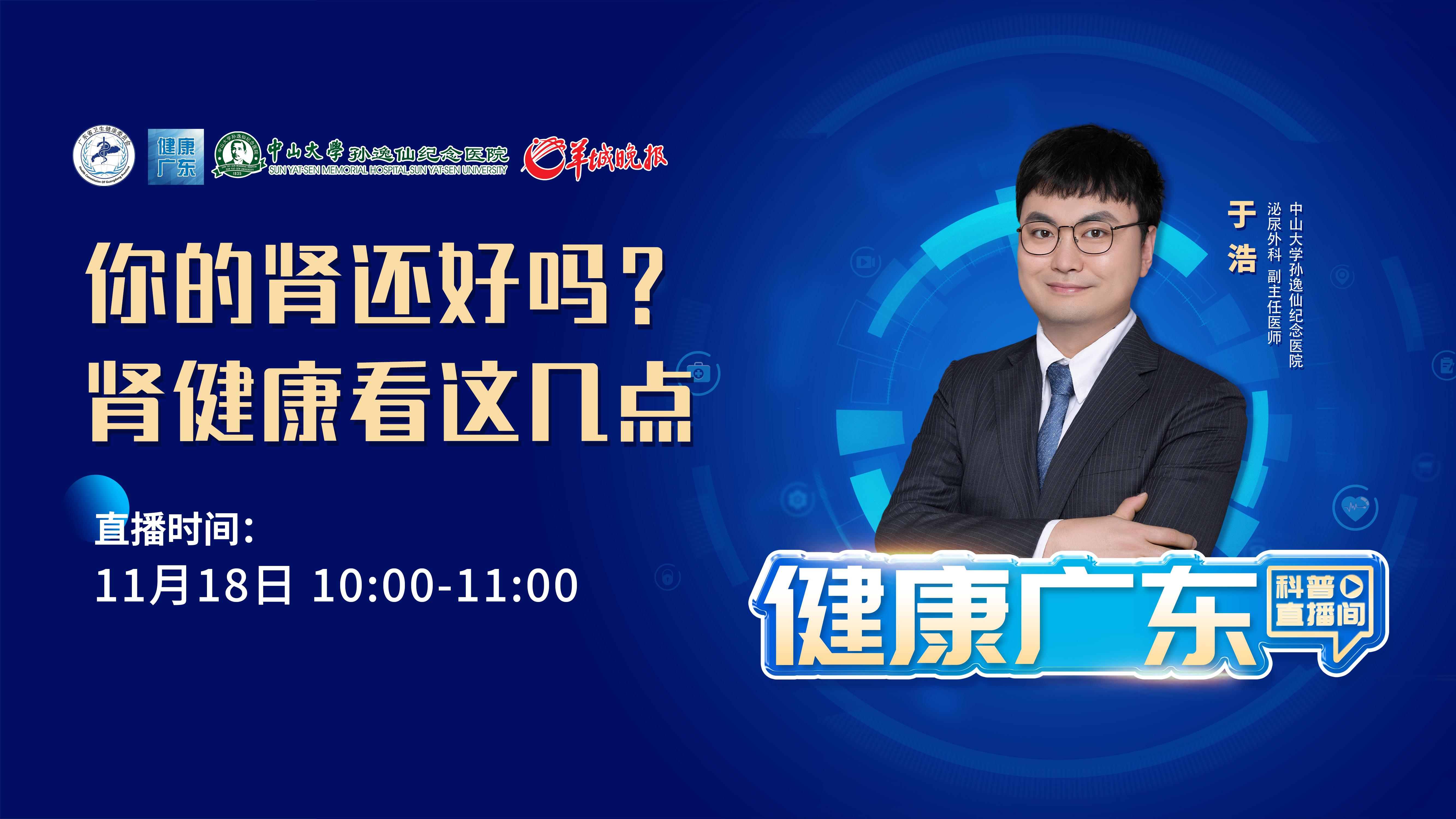 在广东省卫健委的指导下,中山大学孙逸仙纪念医院联合羊城晚报推出“大咖云集探‘泌’解惑”系列直播。11月18日,我们特别邀请中山大学孙逸仙纪念医院泌尿外科副主任医师于浩直播开讲“你的肾还好吗?肾健康看这几点”,其中的精彩内容与读者分享。
