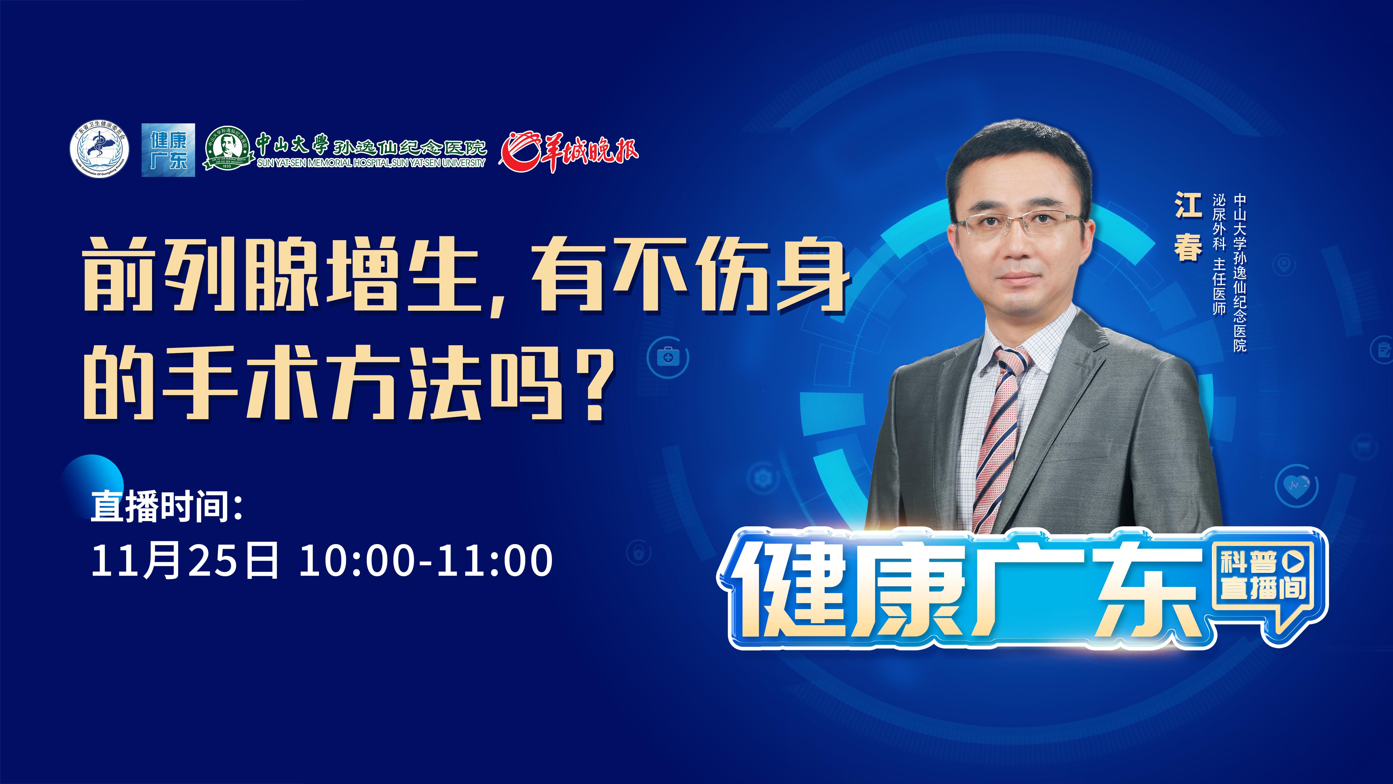 在广东省卫健委的指导下,中山大学孙逸仙纪念医院联合羊城晚报联合推出“大咖云集探‘泌’解惑”系列直播。11月25日,我们特别邀请中山大学孙逸仙纪念医院泌尿外科主任医师 江春直播开讲“前列腺增生,有不伤身的手术方法吗”,现将其中的精彩内容与读者分享。