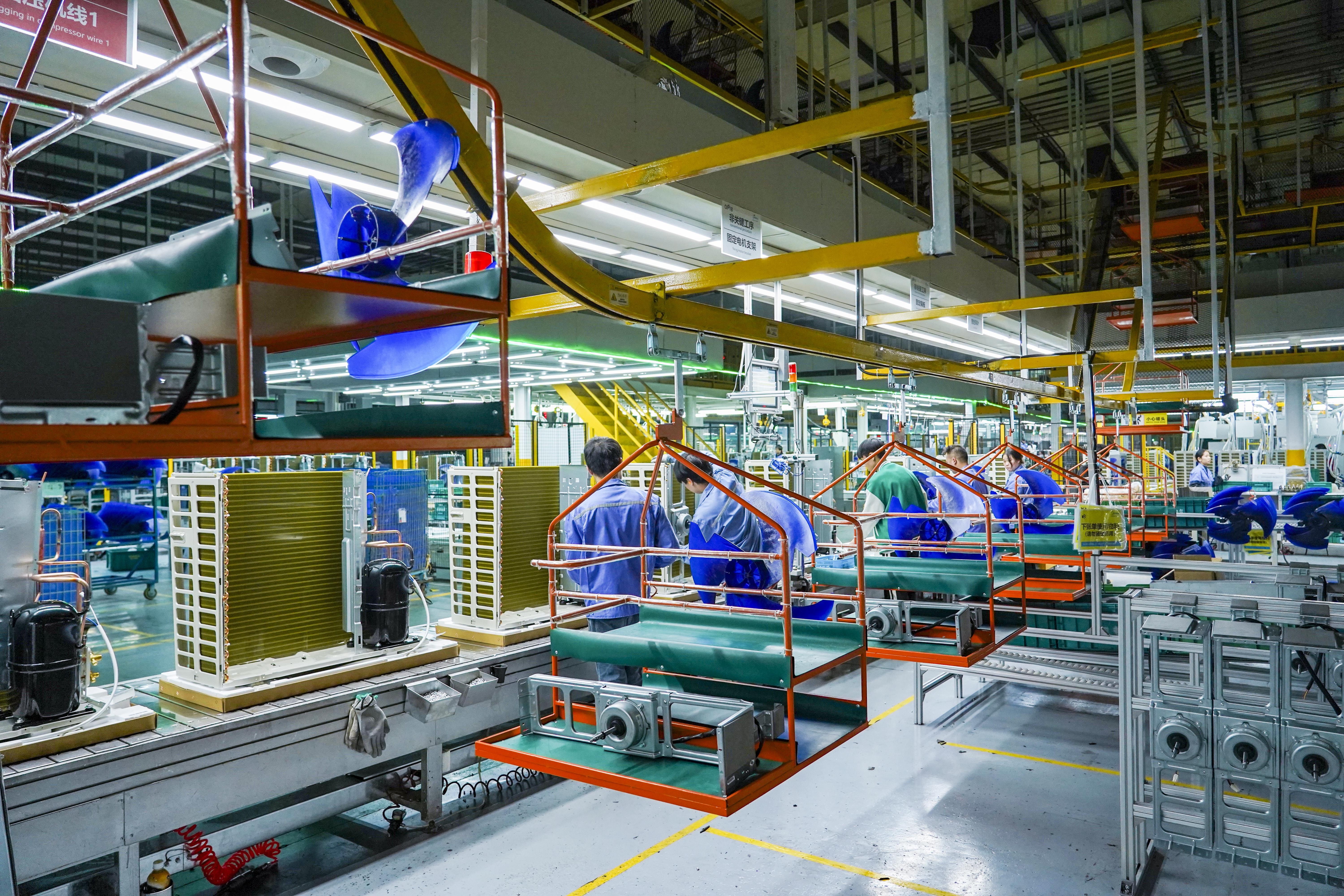 记者走进广东美的制冷设备有限公司的生产车间看到,一个个外机零件“赤裸”地摆放在传送带上,一线工人有条不紊地拿起这些部件组装空调外机。
