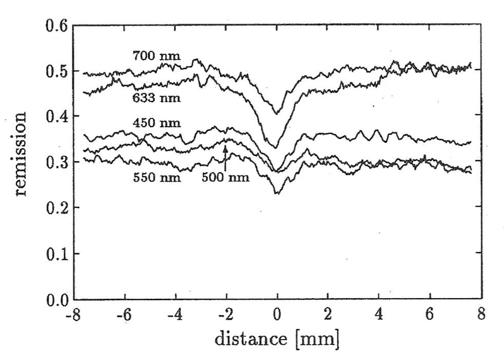 根据视网膜色彩感知理论(Retinex 理论),人眼通过对比血管区域和周围组织的反射光比例感知颜色。由于红光反射的减少更显著,人眼最终将静脉感知为青色。