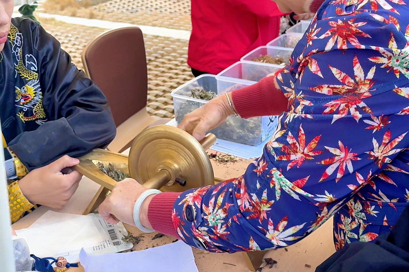 在中医游戏摊位,艾草锤、中药香囊制作,辨识中药材、穴位科普、猜灯谜等游戏项目也排起了长队,市民群众通过游戏对中医药文化有了更加深入的了解。