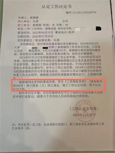 12月3日,崔丽丽收到了天津市津南区人社局出具的《认定工伤决定书》(以下简称《决定书》)。