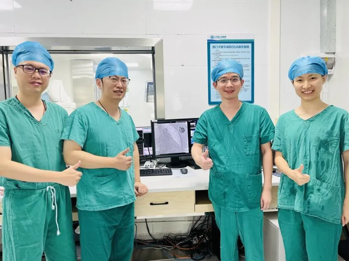 手术中,两位博士与当地医院心血管内科介入团队配合,经阿婆左侧锁骨下静脉入路,通过约3-5厘米切口,精准将一枚起搏器植入到右心室室间隔处。