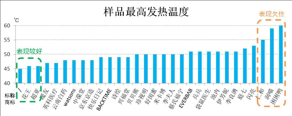 本期所有样品均能发热至40℃,有11款超过50℃,最高可达60℃,体感发烫,可能引起眼部皮肤灼伤;余下19款发热均不超过50℃,且有3款不超过46℃,能够为消费者提供更加安心且舒适的热敷体验。