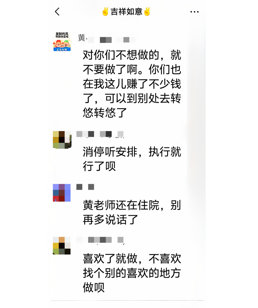 一些群友也站出来附和黄岩,劝她“消消气”,并大肆指责提出质疑的病友:“开除”“不带他做了”。这些插曲,总会以提出质疑的人对黄岩表达“感恩戴德”告终。