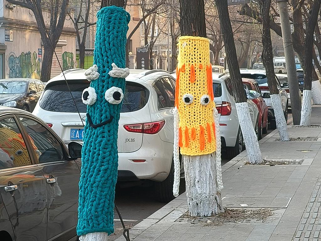 在内蒙古呼和浩特一些行道树穿上毛衣,被装扮成多种造型。