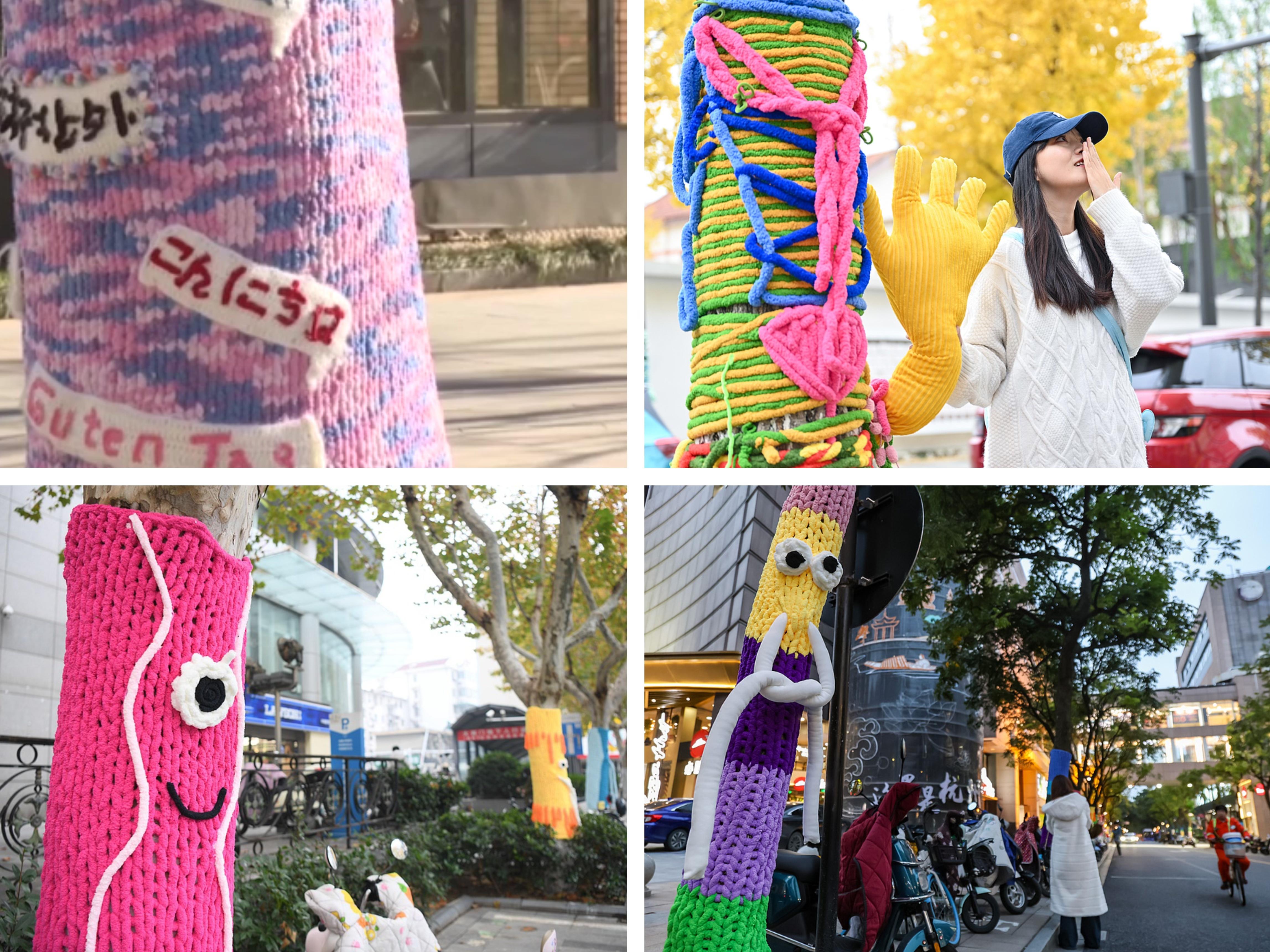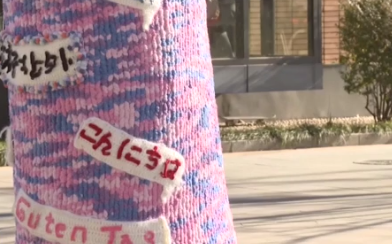 在北京外国语大学校园,大树穿上的“北外限定款”毛衣,都是学校的离退休教职工编织的。