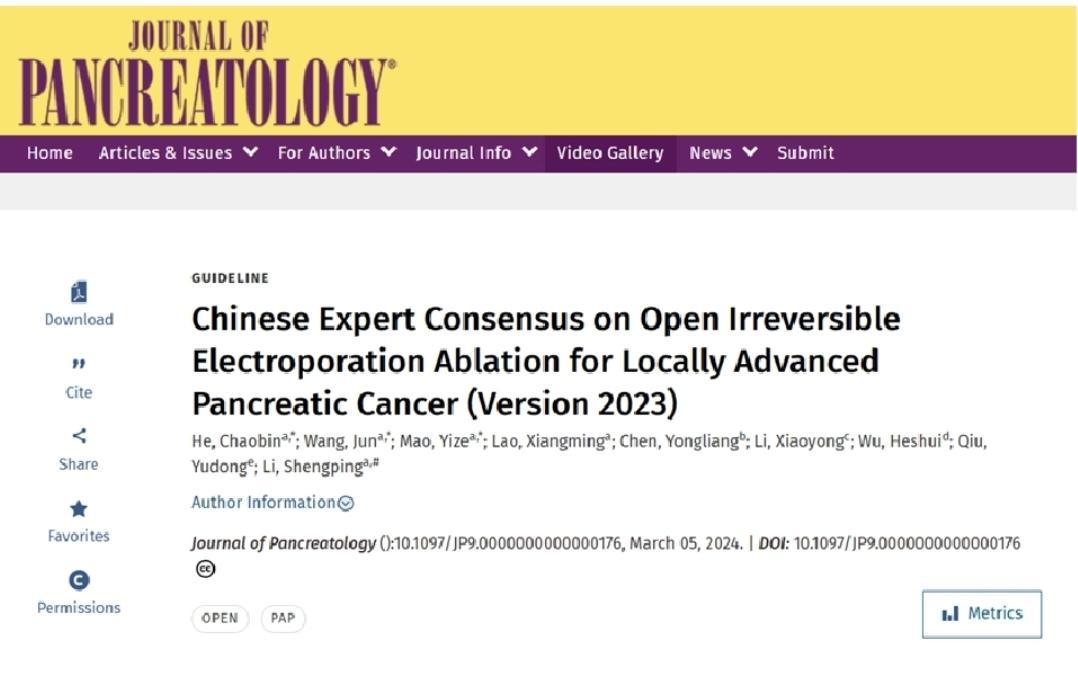 中肿胰胆外科牵头制定的“开腹下纳米刀治疗局部进展期胰腺癌专家共识”已在国际权威医学期刊《胰腺病学杂志(Journal of Pancreatology)》上发表。