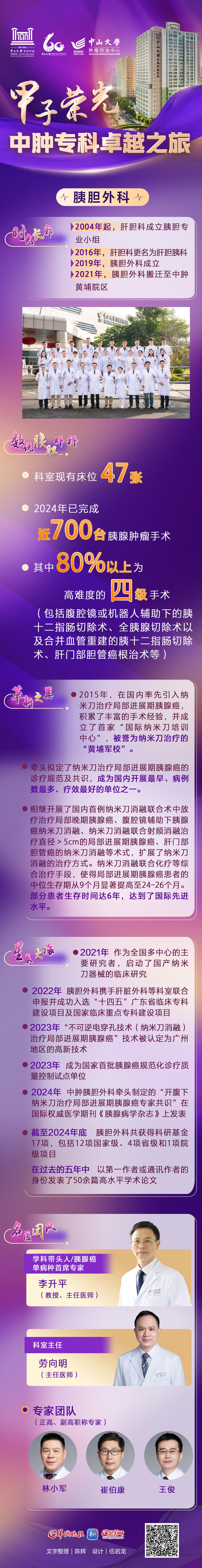 截至本文发稿时,2024年胰胆外科已完成近700台胰腺肿瘤手术,其中80%以上为高难度的四级手术,包括腹腔镜或机器人辅助下的胰十二指肠切除术、全胰腺切除术以及合并血管重建的胰十二指肠切除术、肝门部胆管癌根治术等。科室以综合治疗、微创手术和纳米刀消融技术为特色,成为国家首批胰腺癌规范化诊疗质量控制试点单位,在华南地区独树一帜,为患者提供了高质量的医疗服务。