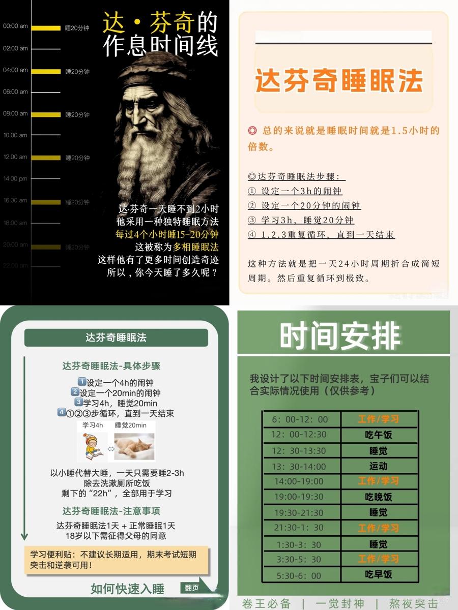 最近,社交平台上流行起各种“碎片化睡眠法”:某知名人士称自己工作时一天可以只睡4小时;有博主称,很多名人都会采用“达芬奇睡眠法”,即工作4个小时,小睡30-40分钟,循环往复,包括达芬奇、爱迪生、拿破仑、撒切尔夫人等都这样睡觉,能大大提高工作效率;还有博主给学生列出时间安排表,表示每睡2小时起来学习1小时,循环往复,这样做可以把时间利用到极致……
