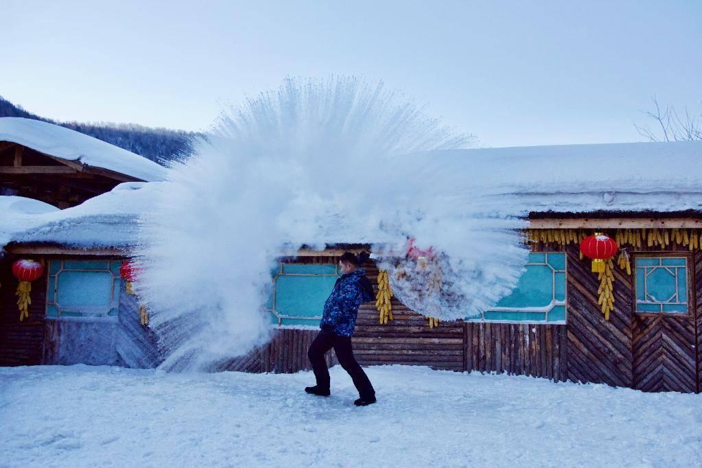 冰雪世界中,手持一杯或一壶热水,用力将水泼向空中,划出一道圆弧线,万缕冰丝花,如同烟花般落下。