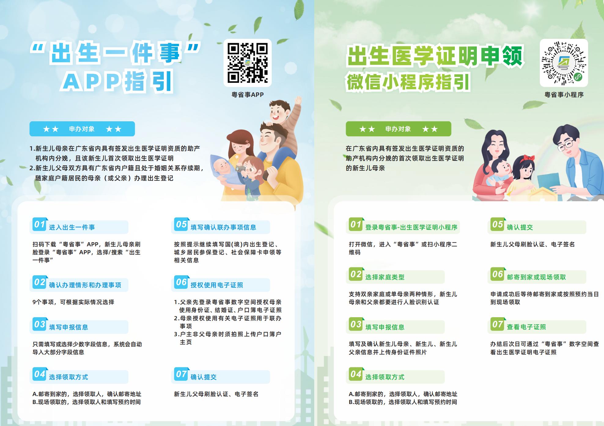 从今年9月底起,在粤省事APP不断优化,上线新生儿生育登记凭证签发、出生医学证明签发、预防接种电子档案申领、国(境)内出生登记、城乡居民参保登记(基本医疗保险)、社会保障卡申领、城乡居民基本医疗保险费申报(新生儿医保缴费)、生育医疗费用报销、科学育儿指导服务登记等9个“单项事”,并且整合为“出生一件事”。