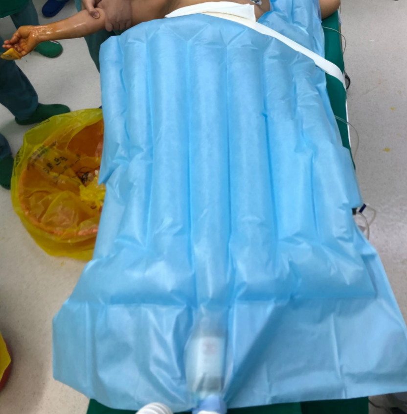 进入手术室后,巡回护士会在患者身上铺设充气式升温毯进行术前保温。杨睿教授介绍:“这种充气式加温毯不仅能提升体表温度,还能有效减少热量散失。”