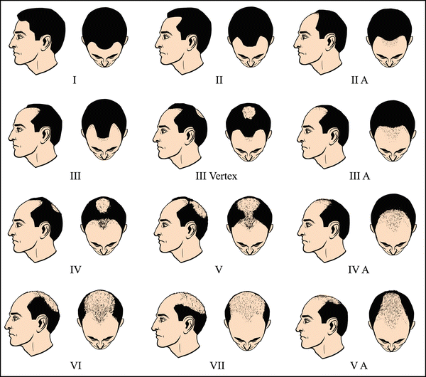 下面是男性和女性雄激素性脱发的模式图,大多数人的程度不太严重,尤其是女性,很难出现头发掉光、变成“地中海”的程度。