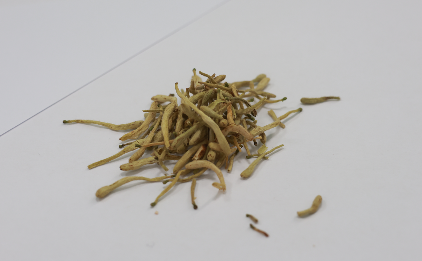 外观:金银花多为棒槌形花蕾,黄绿色细长,密披绒毛,有香味。