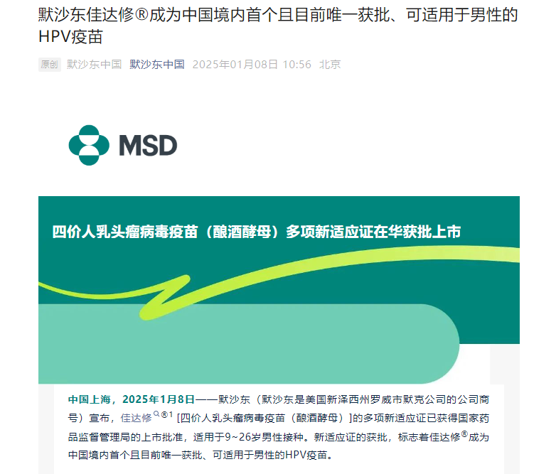 据默沙东新闻稿,其四价HPV疫苗此次获批的新适应证可适用于9-26岁男性预防因HPV16、18引起的肛门癌,HPV6和11引起的生殖器疣(尖锐湿疣),以及由HPV6、11、16、18引起的肛门上皮内瘤样病变。