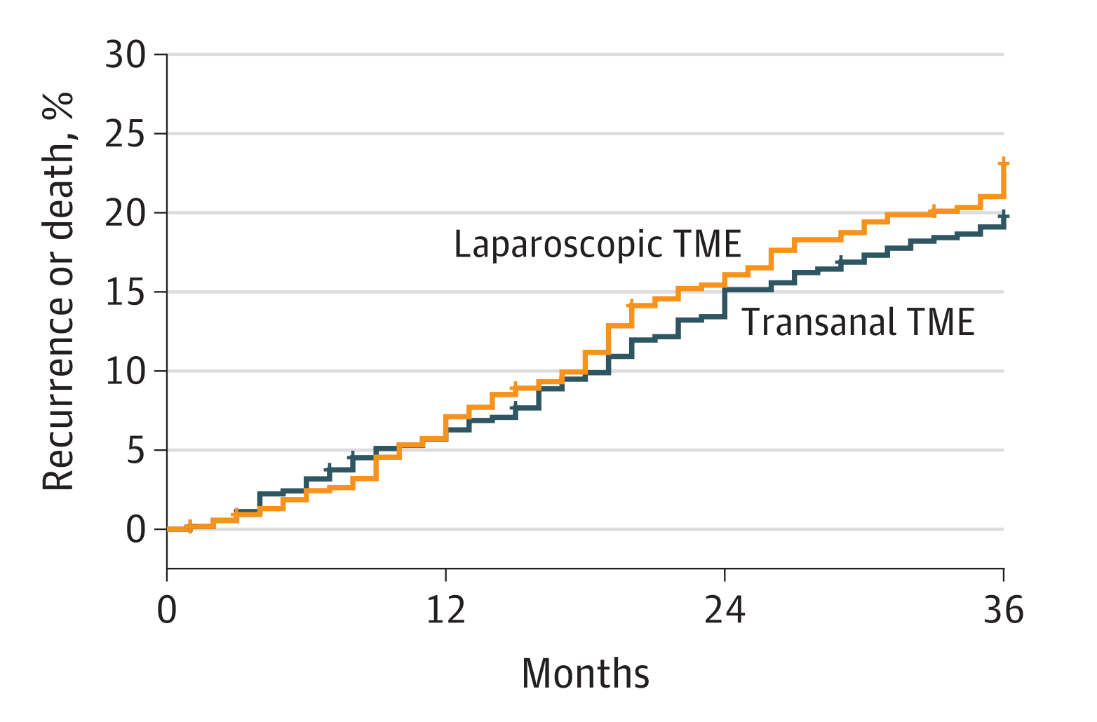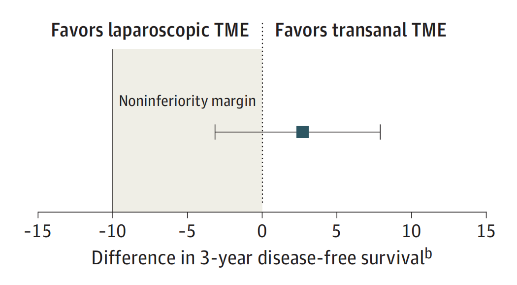 3年无病生存率的分析显示,taTME组的3年无病生存率为82.1%,对比传统经腹手术(laTME)组的79.4%,证实了taTME在3年无病生存率方面与传统经腹(laTME)同样安全有效。研究团队还发现,与传统腹腔镜手术相比,经肛手术的并发症发病率更低、首次下床活动时间和术后恢复活动时间更短。