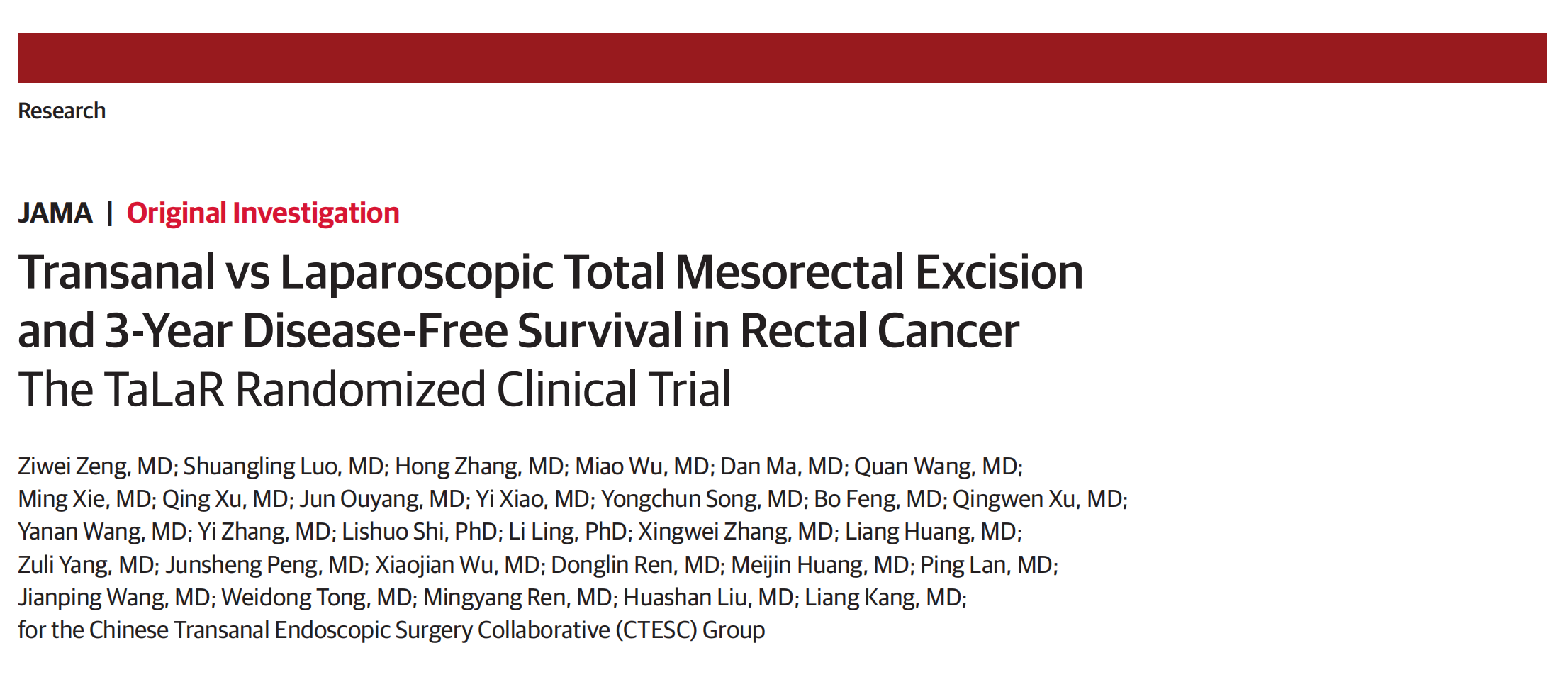 该研究成果来自中山六院荣誉院长、结直肠外科汪建平,副院长、结直肠外科康亮教授团队牵头组建的中国经肛腔镜外科研究协作组。团队经过研究,证明了taTME在治疗直肠癌方面的安全性和有效性。据介绍,该成果全球首个关于“经肛腔镜直肠癌根治手术”的高级别证据,于2024年被纳入美国结直肠外科医师协会官方指南。