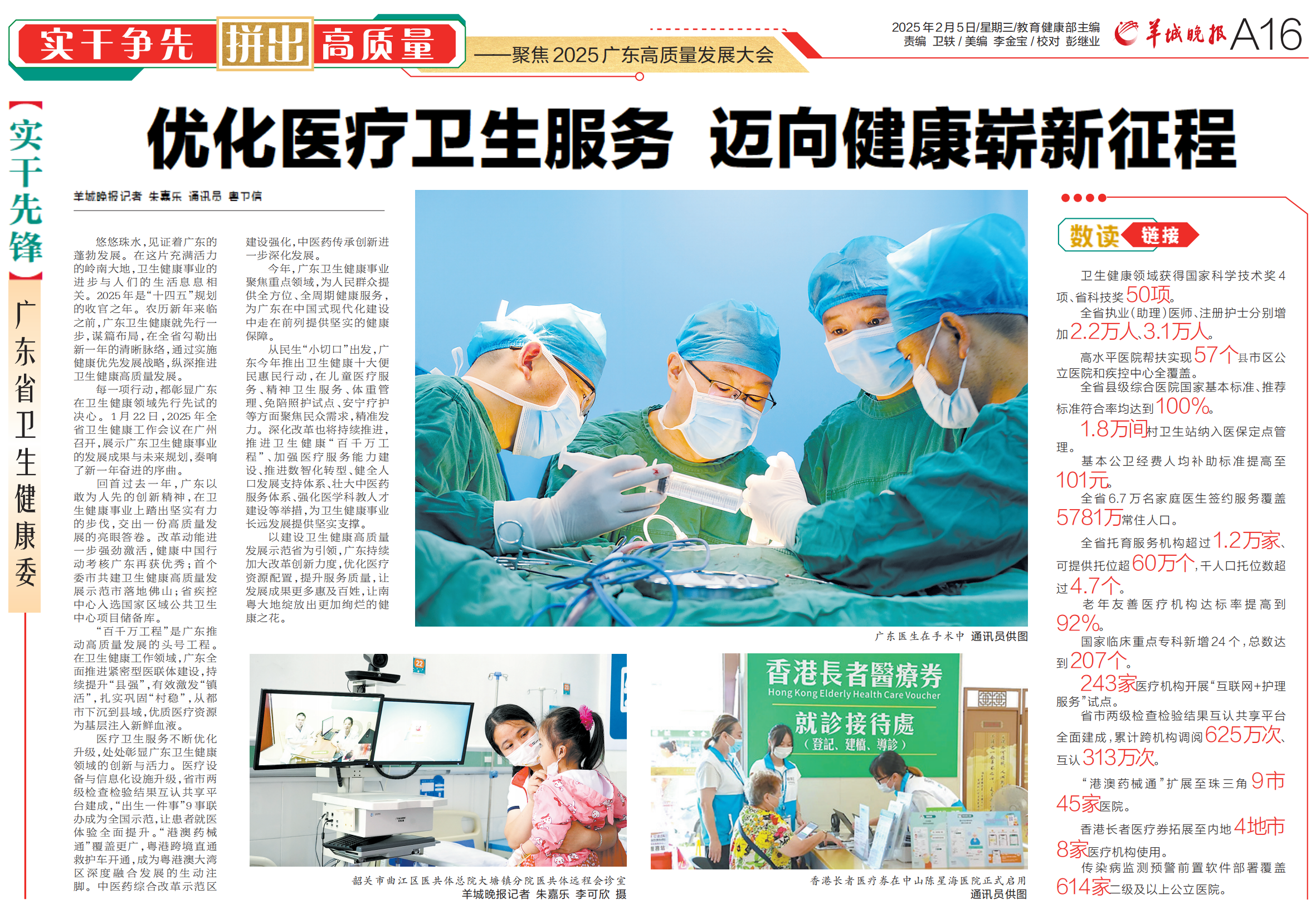 悠悠珠水,见证着广东的蓬勃发展。在这片充满活力的岭南大地,卫生健康事业的进步与人们的生活息息相关。2025年是“十四五”规划的收官之年。农历新年来临之前,广东卫生健康就先行一步,谋篇布局,在全省勾勒出新一年的清晰脉络,通过实施健康优先发展战略,纵深推进卫生健康高质量发展。