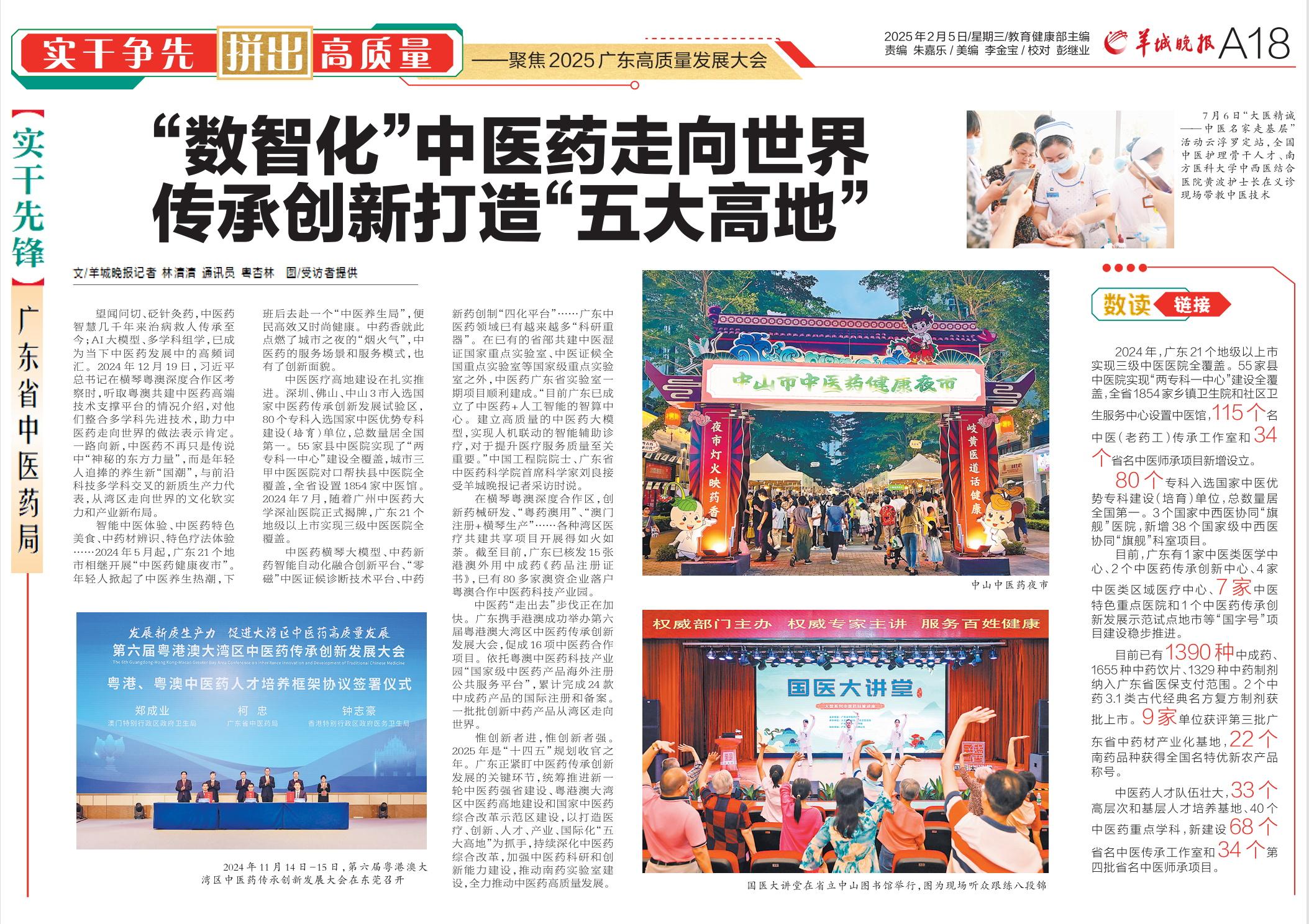 惟创新者进,惟创新者强。2025年是“十四五”规划收官之年。广东正紧盯中医药传承创新发展的关键环节,统筹推进新一轮中医药强省建设、粤港澳大湾区中医药高地建设和国家中医药综合改革示范区建设,以打造医疗、创新、人才、产业、国际化“五大高地”为抓手,持续深化中医药综合改革,加强中医药科研和创新能力建设,推动南药实验室建设,全力推动中医药高质量发展。