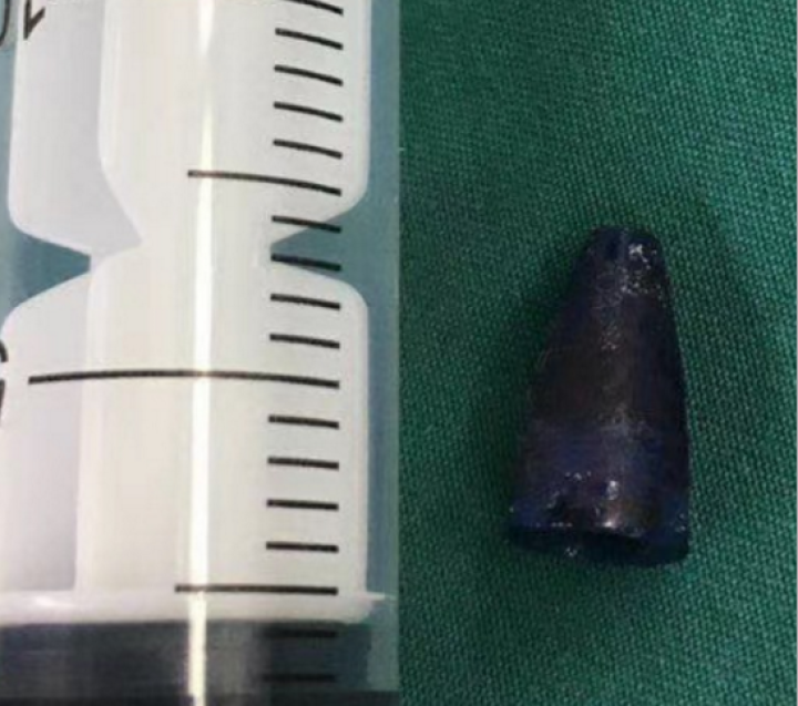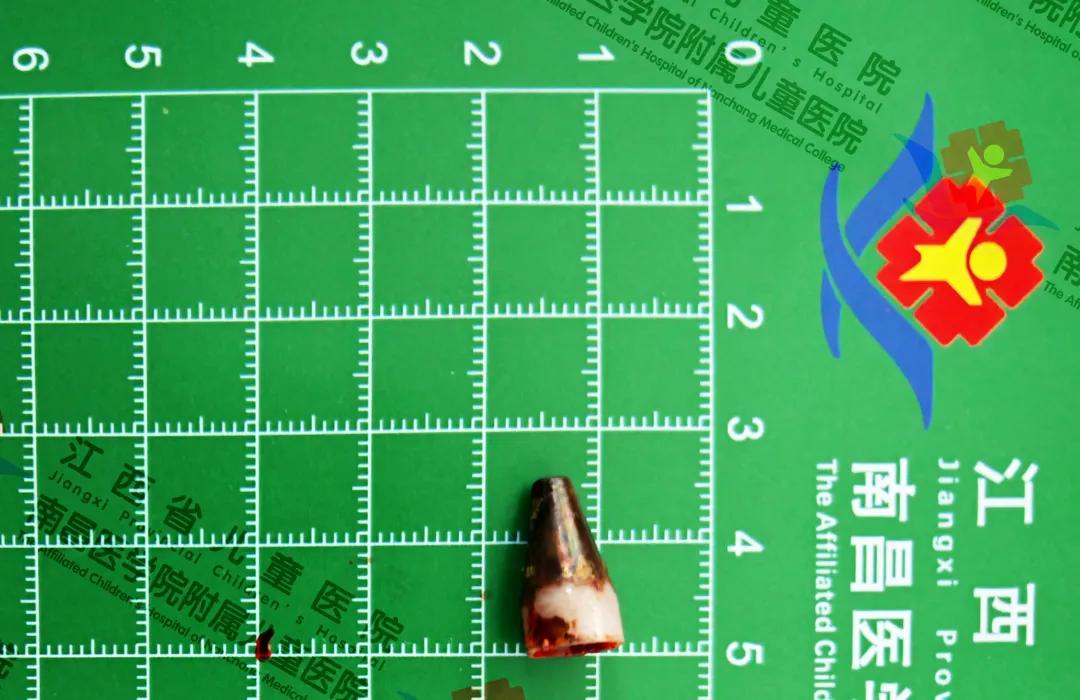 皓皓异物呛入时间长、位置深、异物嵌顿严重,顺利取出困难,手术难度大。最后,在多学科团队的协同配合下,医生将将锥状型,长约1.5cm的硬质笔头取出。