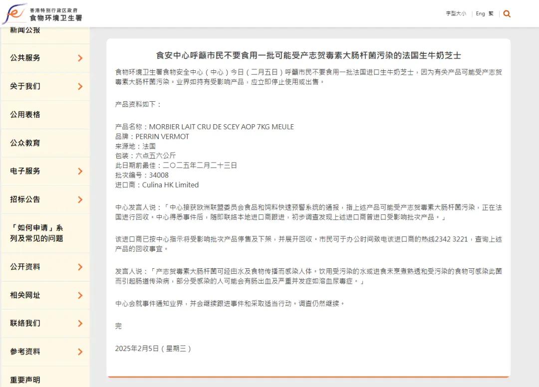 2月23日,香港食物环境卫生署食物安全中心呼吁市民:不要食用一批法国进口生牛奶芝士,因为有关产品可能受产志贺毒素大肠杆菌污染。业界如持有受影响产品,应立即停止使用或出售。