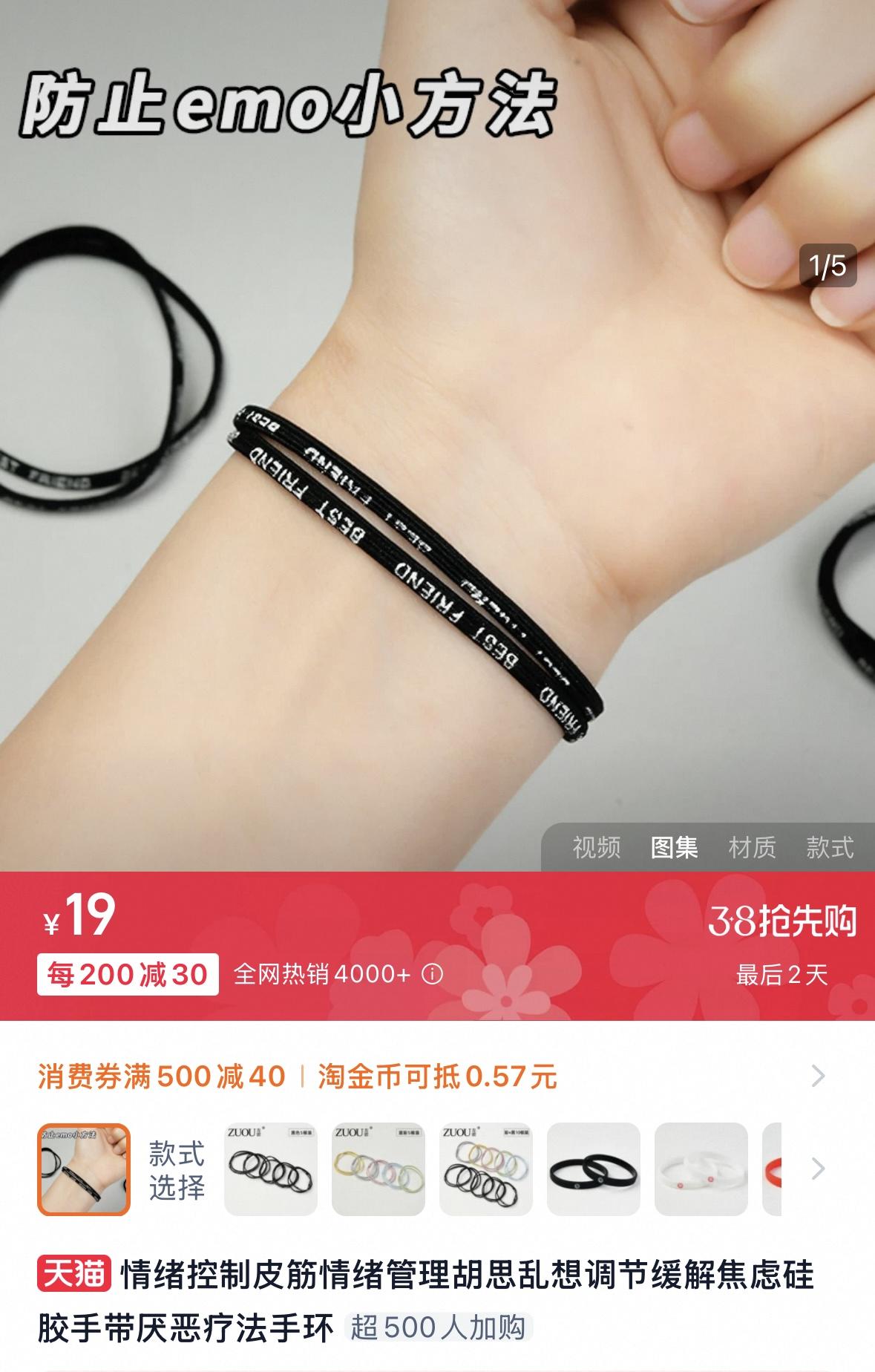 “当时商家说可以通过弹皮筋来缓解负面情绪,虽然能看出价格有些虚高,但还在可接受范围内,所以就买了。”李雯昭是一名大一学生,曾被确诊为心境障碍。她在网上看到关于“情绪控制皮筋”的宣传后,出于好奇购买并尝试使用。