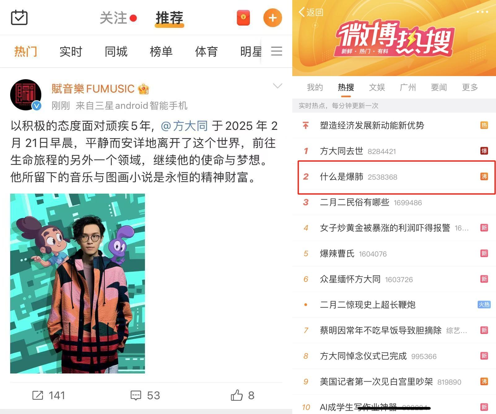 3月1日中午,方大同创立的音乐厂牌赋音乐发布消息:以积极的态度面对顽疾5年,方大同于2025年2月21日早晨,平静而安详地离开了这个世界。据悉,2010年方大同曾因操劳过度出现气胸(爆肺)而数度住院。2024年方大同回归时表示自己正在康复的路上,身体状况已有了长足的改善,但还未完全康复。大众惊愕惋惜之时,#方大同去世 #什么是爆肺同时冲上热搜。