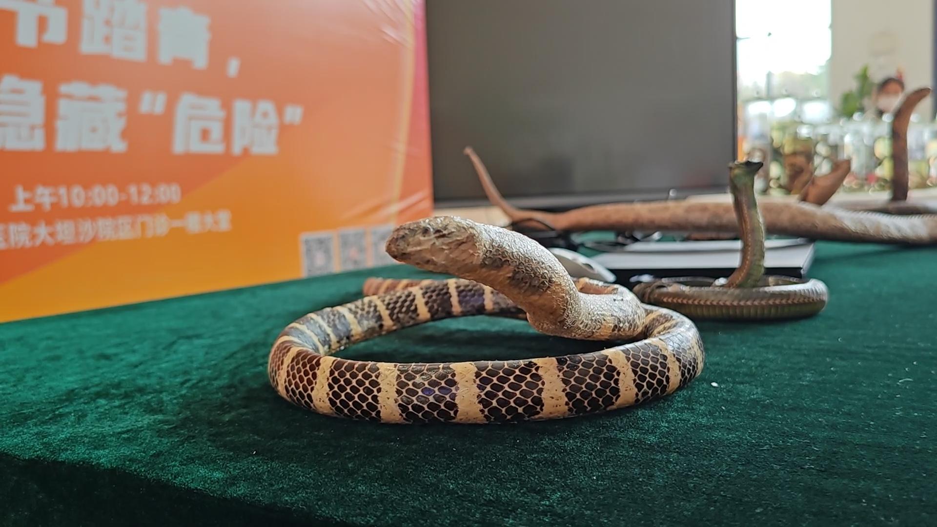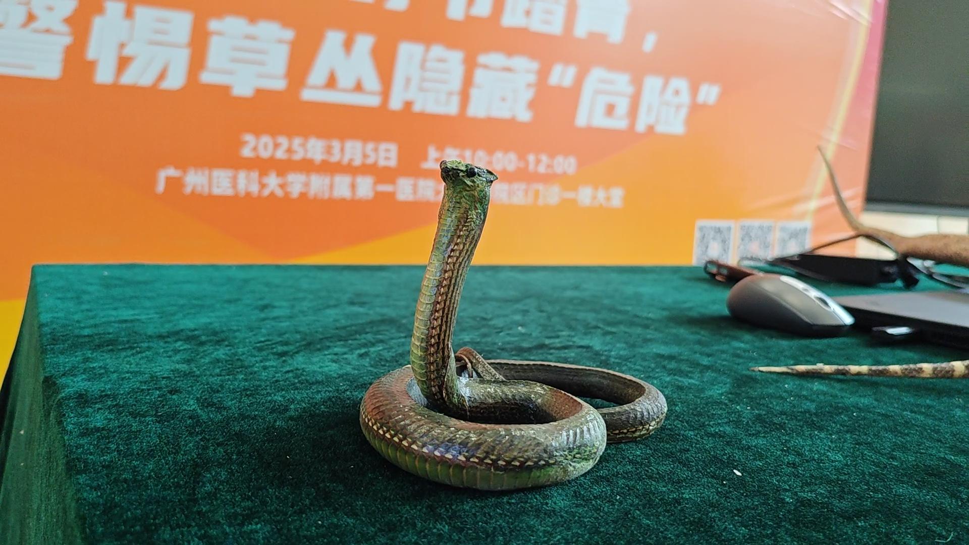 在惊蛰当天,广州医科大学附属第一医院(下简称“广医一院”)中竟然出现了“一群蛇”!原来是医院举行了“惊蛰踏青,警惕草丛隐藏‘危险’”的主题科普与义诊活动。现场不仅有专家为群众讲解了春季踏青应对蛇类的健康知识,还有蛇类模型、标本现场展出,帮助群众辨认毒蛇、远离危险。
