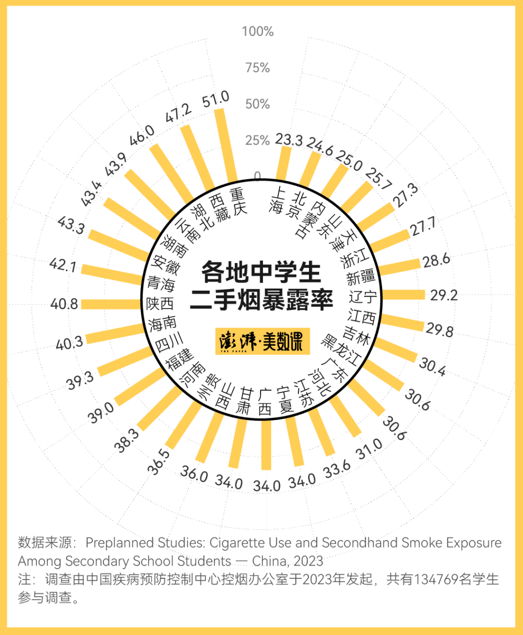 中国疾病预防控制中心曾于2019年、2021年、2023年针对国内的中学生开展了青少年烟草调查。根据2023年的数据显示,就各地中学生在学校的二手烟暴露率情况来看,重庆、西藏、湖北等地的中学生更频繁地会受到二手烟的困扰,其中重庆地区,中学生的二手烟暴露率高达51%,而上海、北京等地的中学生的二手烟暴露率则相对较低,上海地区整体为23.3%。
