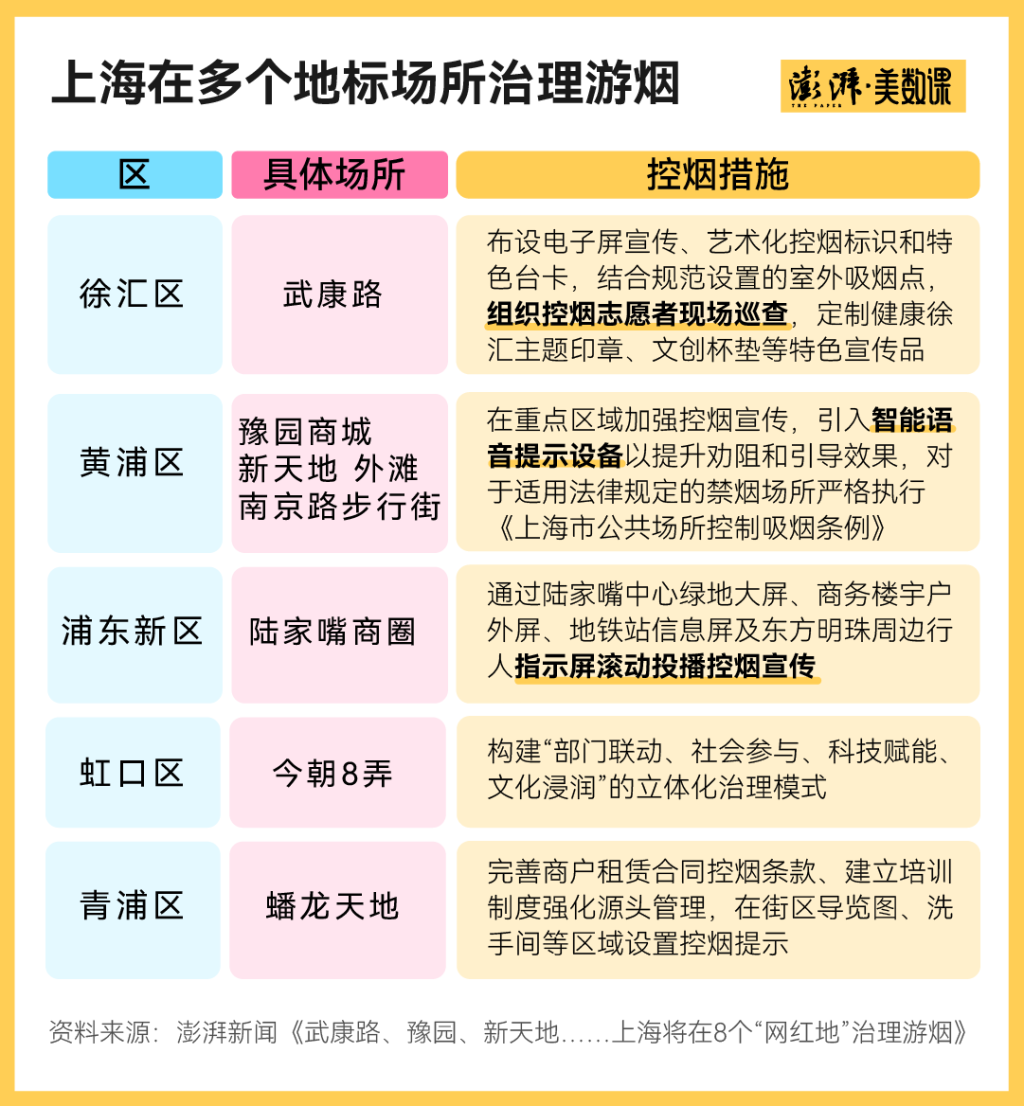从今年3月中旬起,武康路、豫园商城、新天地、外滩、南京路步行街等8个中外游客集中、人群密集的“网红”地标场所率先、重点推进控烟工作,加强室外控烟管理,从而形成示范效应。