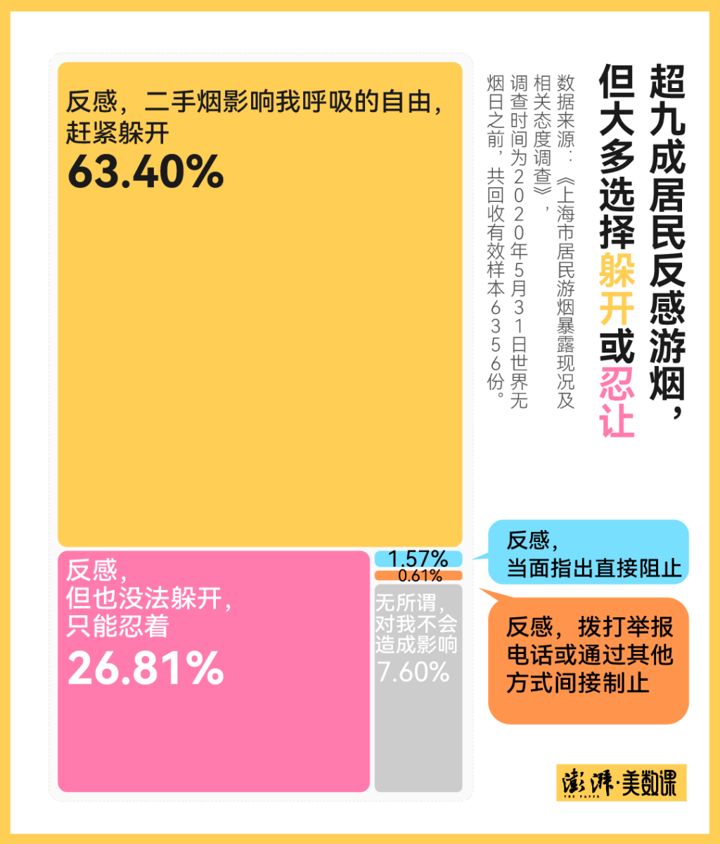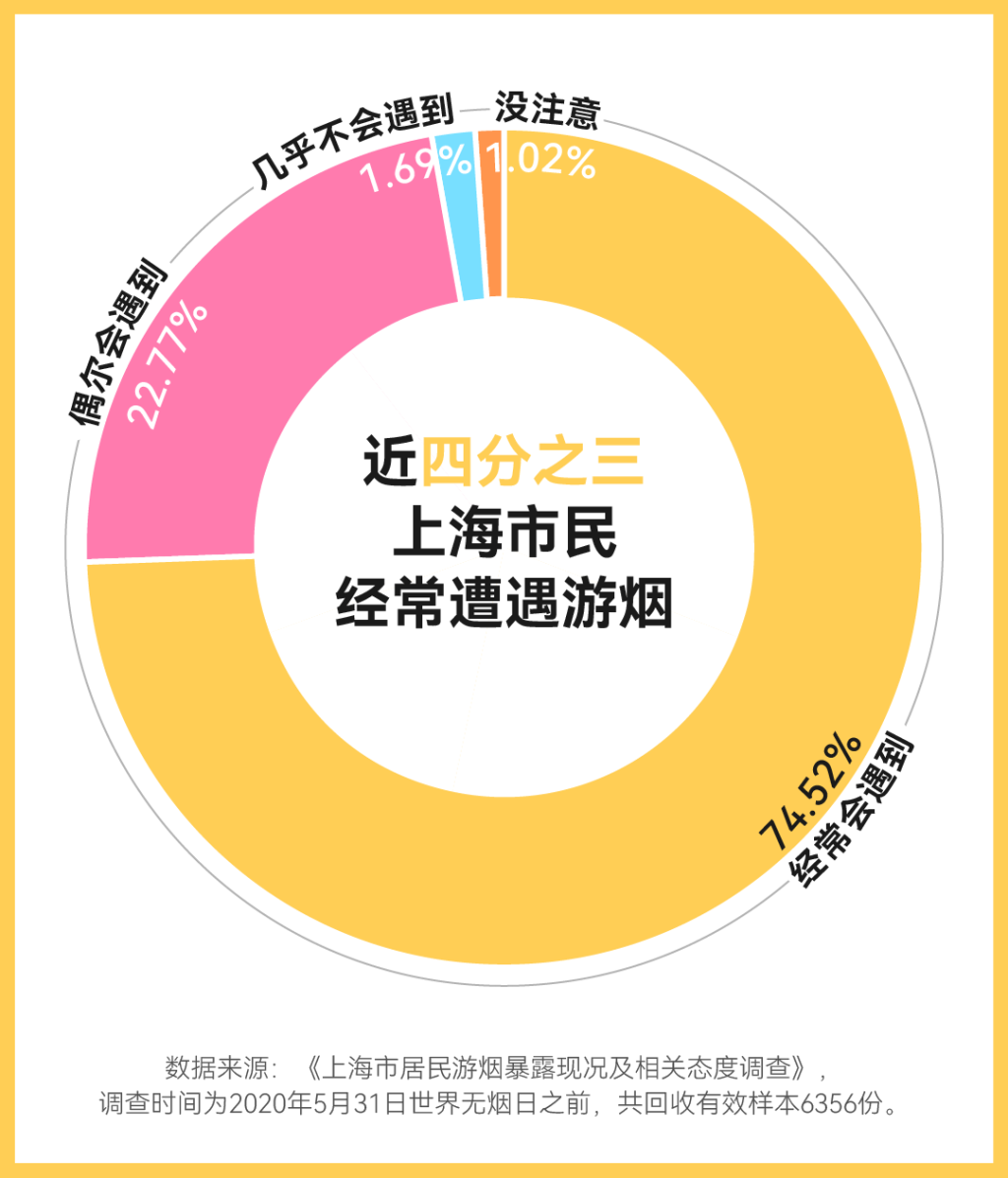 2020年,一份由上海市健康促进中心、复旦大学公共卫生学院共同发起的,面向关注“上海发布”“健康上海 12320”“无烟上海”微信公众号的上海市居民的调查显示,超九成居民表示会遭遇“游烟”。其中,近四分之三的居民频繁遭遇“游烟”。相反,几乎不会遇到“游烟”的居民仅占1.69%。