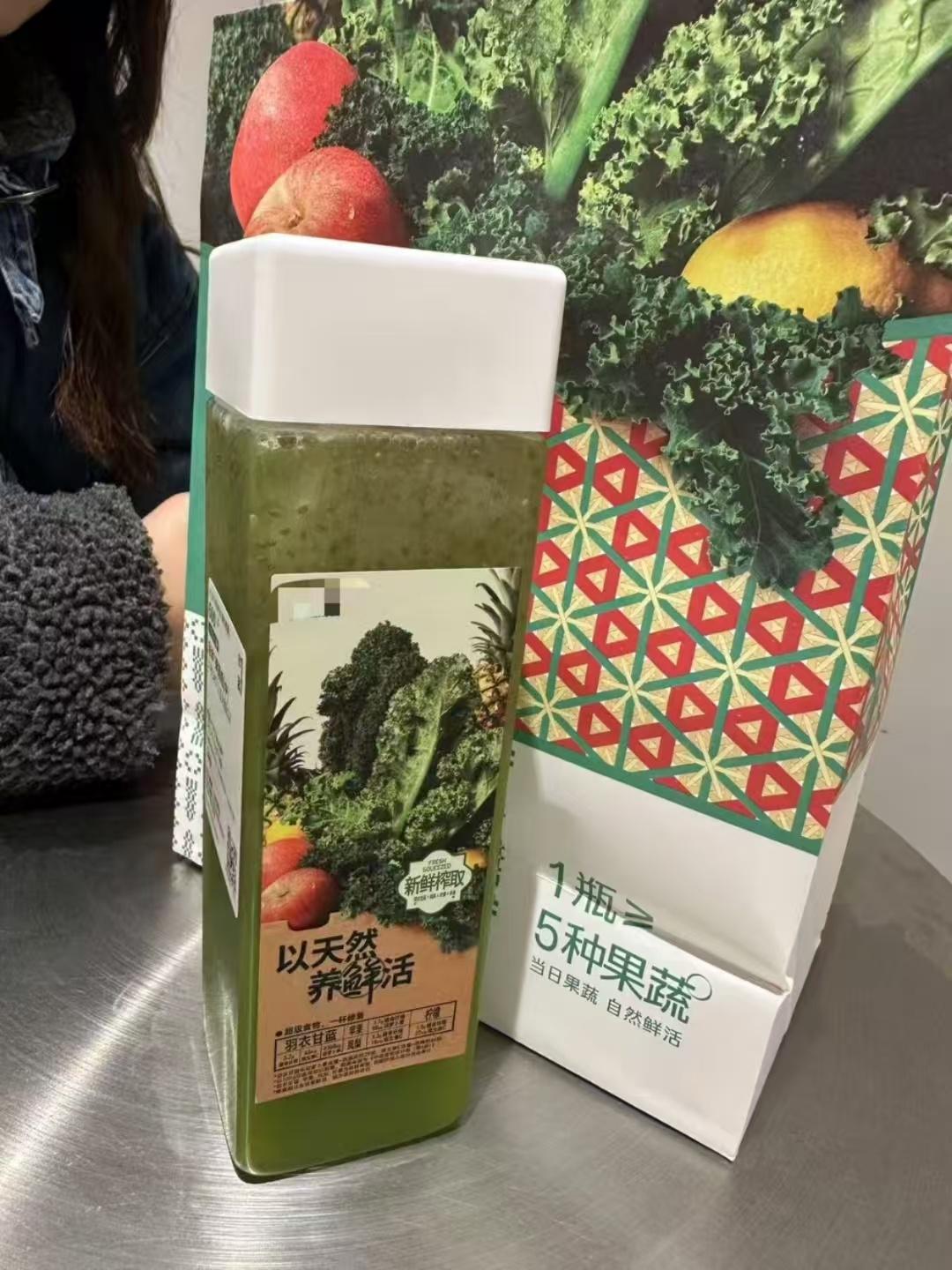 易女士说:“看包装上显示是有羽衣甘蓝、苹果、凤梨、柠檬等,喝起来味道酸酸甜甜的,喝完之后饱腹感挺强的,但是感觉应该没有减肥的功效,果糖还是比较多,价格也比较贵。”