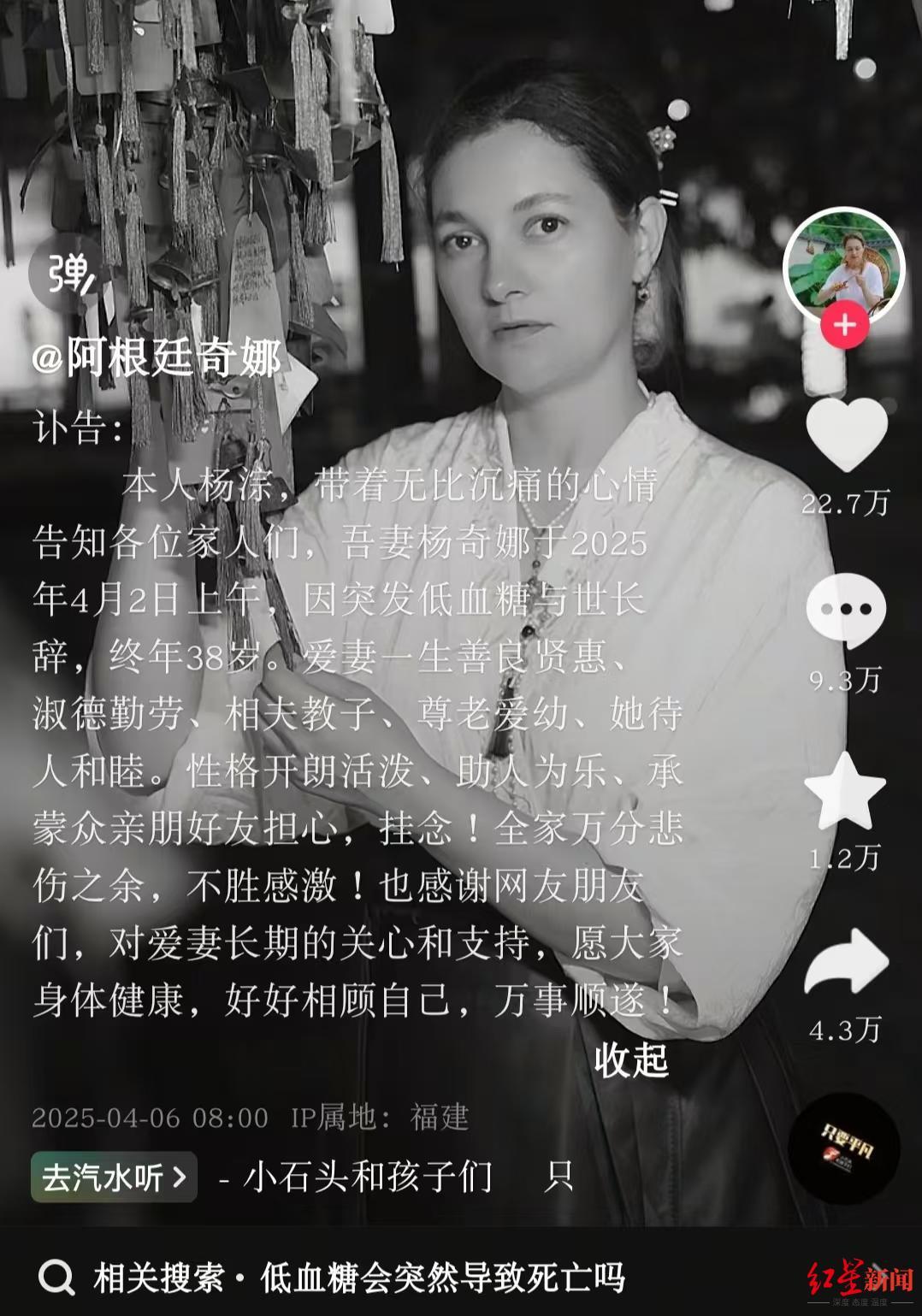 4月6日,抖音账号“阿根廷奇娜”发布了一则讣告——本人杨淙,带着无比沉痛的心情告知各位家人们,吾妻杨奇娜于2025年4月2日上午,因突发低血糖与世长辞,终年38岁……讣告发出后,不少网友在向逝者表达缅怀的同时,也对低血糖是否会致死产生了疑惑,话题“低血糖会突然导致死亡吗”引起广泛关注。