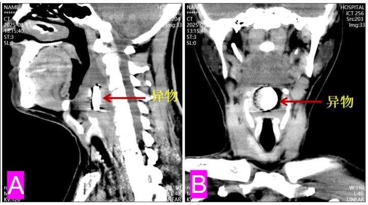 接诊的蔡谦教授团队通过高清喉镜发现端倪——患者咽后壁明显隆起,“拦”在食道入口及声门上缘三分之一,而颈部CT显示下咽部卡着圆形异物,“看起来像一个啤酒瓶盖”。