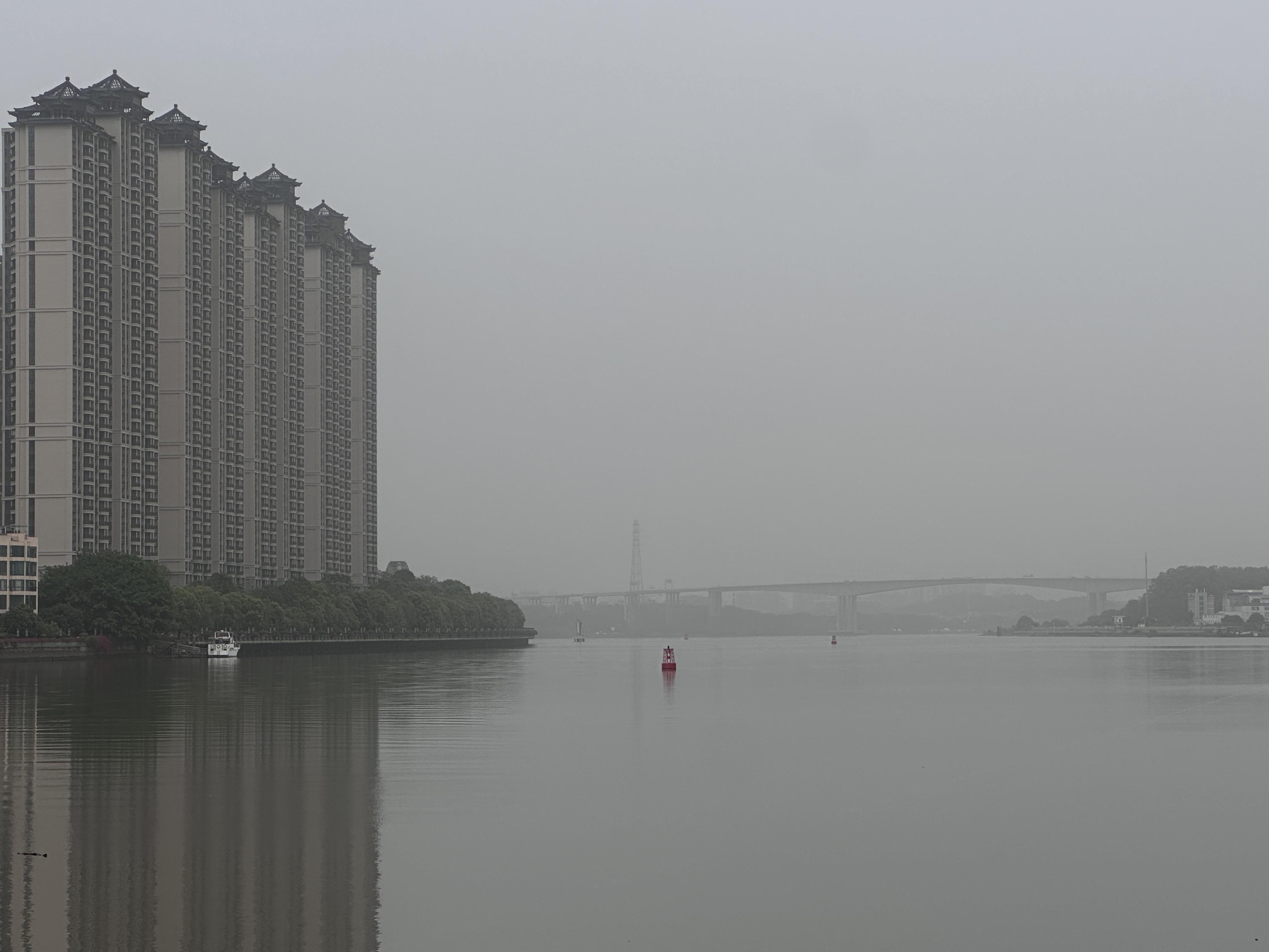 天空灰蒙蒙一片,甚至有点发黄。当天,周末原本在江边会有很多人休闲散步,今天却明显减少。