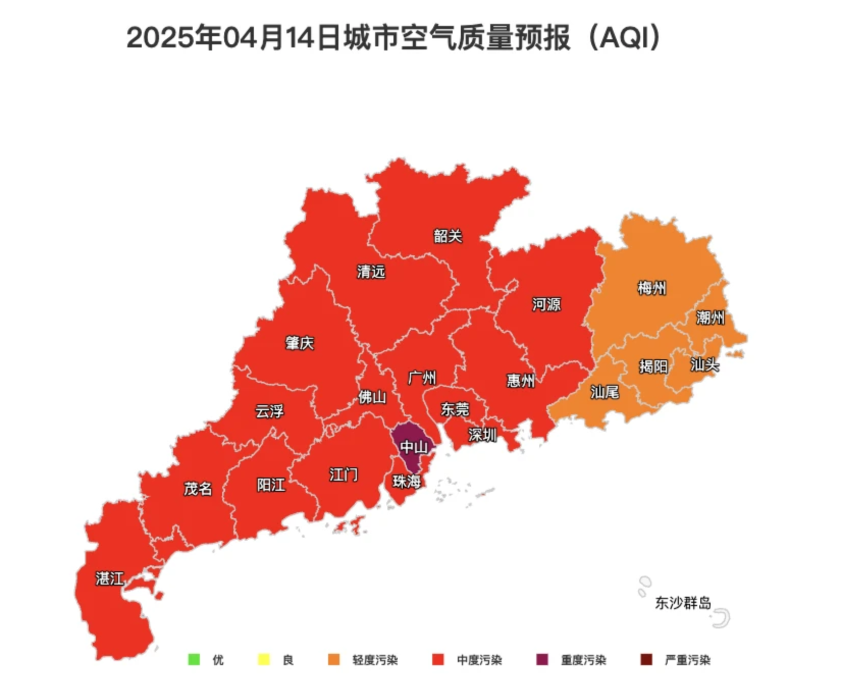 当日,广东省生态环境厅发布的消息称,14日全省空气质量普遍处于轻度至重度污染水平,PM10与PM2.5浓度显著上升。以广州为例,14日空气质量指数(AQI)预计达140-170,PM2.5平均浓度高达100-120微克/立方米,远超国家标准限值(75微克/立方米)。专家分析称,此次沙尘长途奔袭至华南地区较为罕见,北方强沙尘暴的“远程输送”叠加本地臭氧污染,加剧了空气质量的恶化。