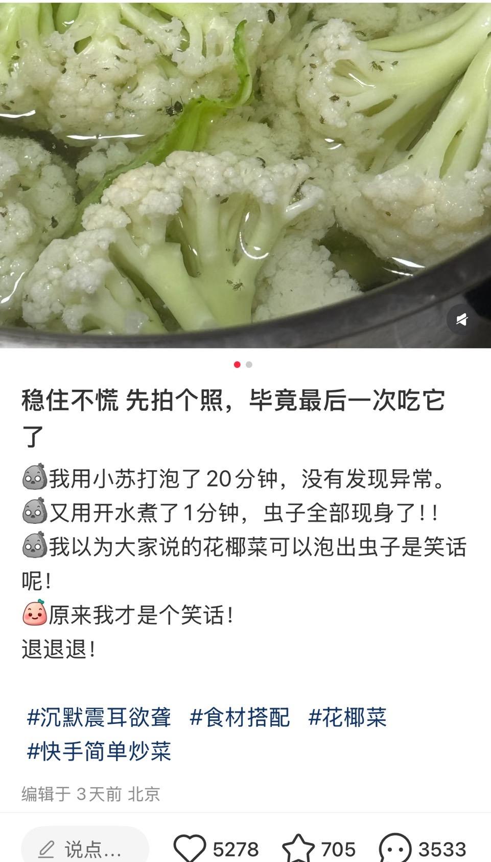 最近,一则关于花菜中藏有虫子的短视频在社交平台受到了广泛关注。视频中,花菜掰开后泡水清洗,水里不一会出现了密密麻麻的绿色小虫子。