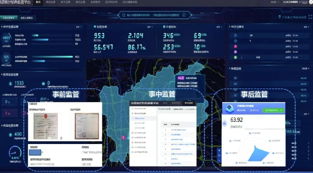 走进白云区卫生监督指挥中心,“智慧云诊所与监管一体化平台”的大屏上,实时跳动着全区诊疗数据。30.84万人次就诊信息、29.37万份电子病历、22.87万张电子处方在此汇聚,AI系统正自动扫描超量处方、禁忌用药等不合理诊疗场景,产生1289条风险预警。这套覆盖“事前提醒—事中控制—事后追溯”的全周期监管系统,让执法人员“足不出户”就能完成机构资质核验、诊疗行为分析,实现数智监管“一键穿透”。