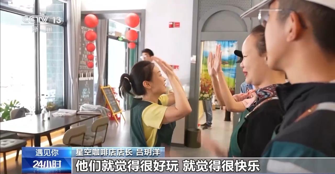 店长吕玥洋说:“我说下午困了吧,我们今天要以问好的方式击掌,从这边一排击下去,他们就觉得很好玩,就觉得很快乐。然后慢慢地有这些简单的肢体接触之后,他就会发现可以跟你去沟通,他的心理防线就没有那么远了。”