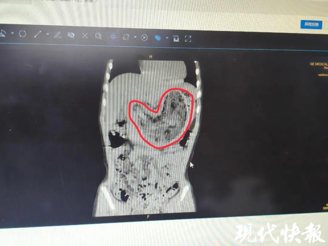 随后,爸爸妈妈带着萱萱又赶到了常州市儿童医院,门诊医生为萱萱进行腹部触诊时,发现她的上腹部存在明显肿块。CT检查显示:孩子的胃被一个巨大的团块状异物塞满,与正常情况相比被撑大了2倍,内部的阴影看起来混杂交错,甚至有一部分已经延伸至十二指肠内。